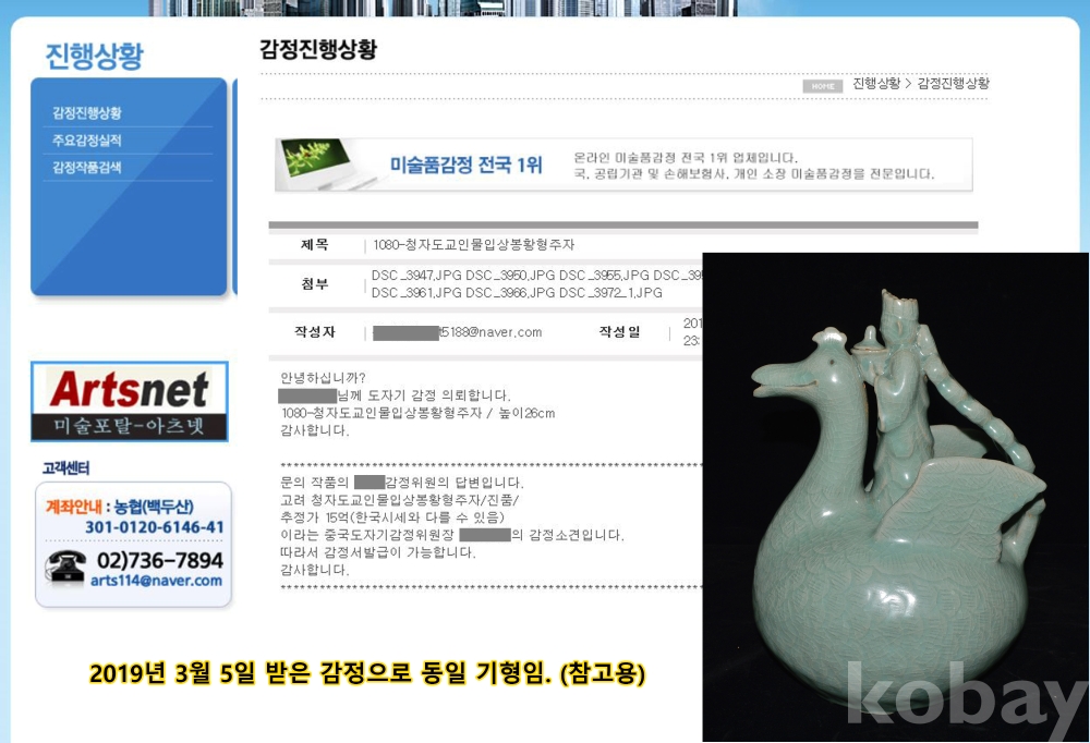 맨 밑의 감정결과서는 같은 모양의 청자로, 참고하시라고 올려 드렸으며, 이미 오래전에 고가로 분양된