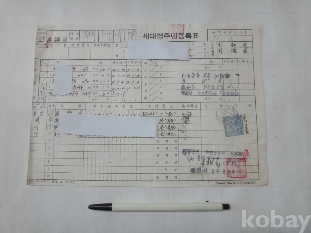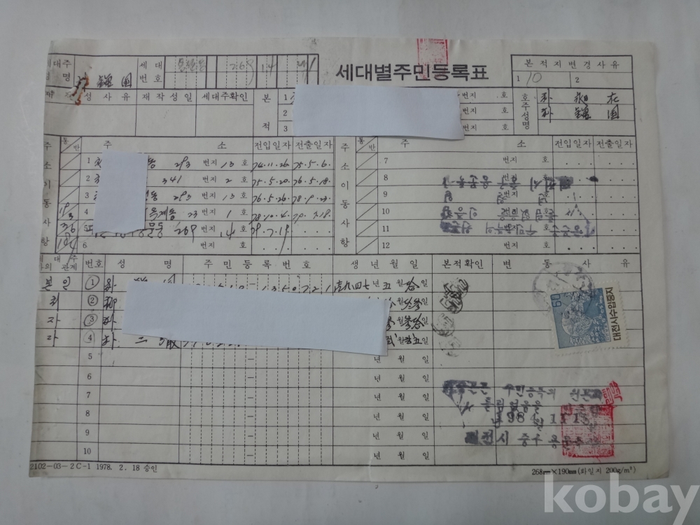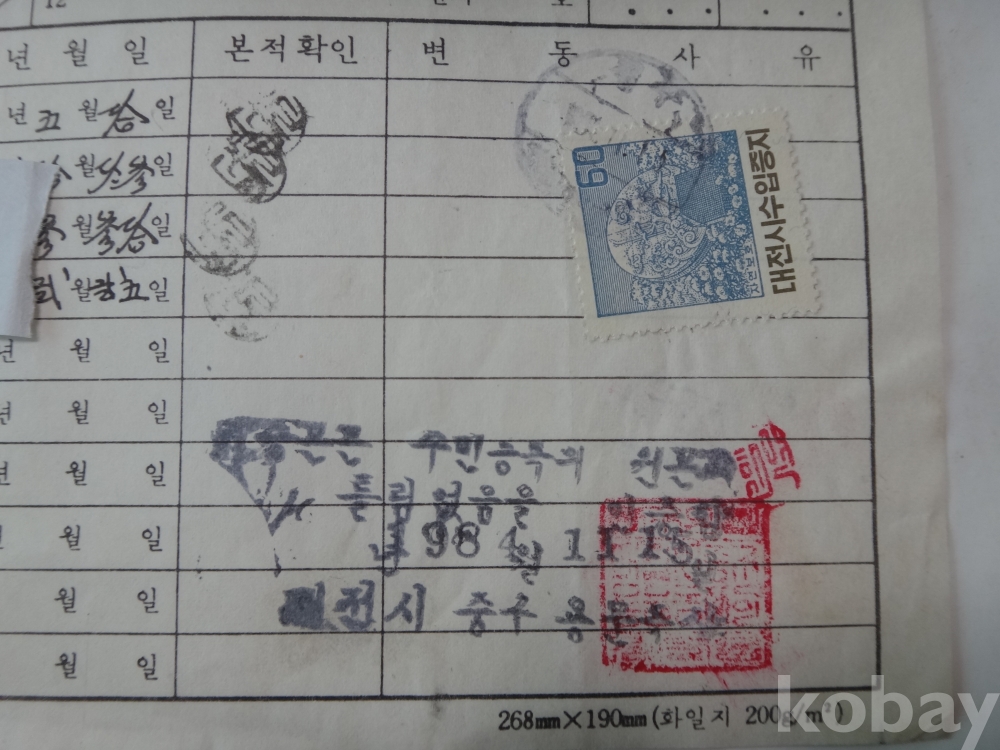 대전시 수입증지 첨부 - 세대별 주민등록 (1984년, 대전시 중구)