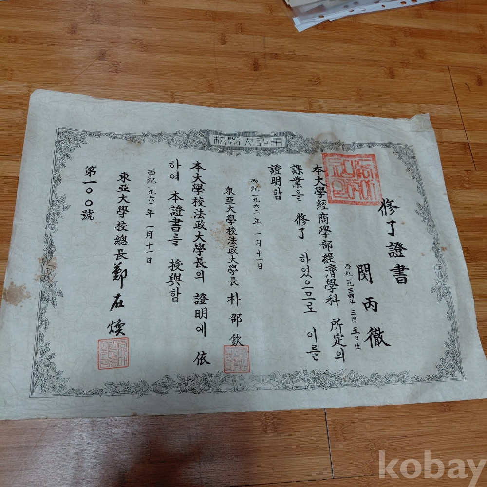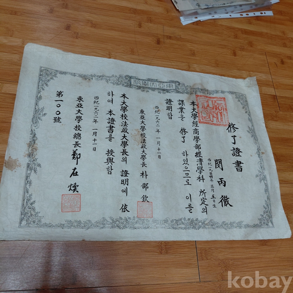 동아대학교 서기1962년 자료증서 한점 올려드립니다
