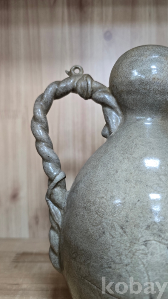 이 청자 주자의 손잡이는 끈을 꼬아 만든 듯한 '꽈배기' 형태의 손잡이로 조각되어 그 끝에는 묶을 수있도록 조각되어,