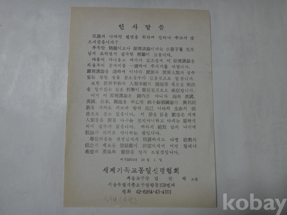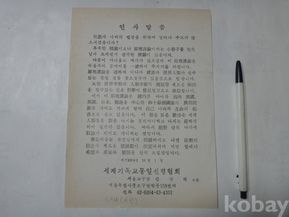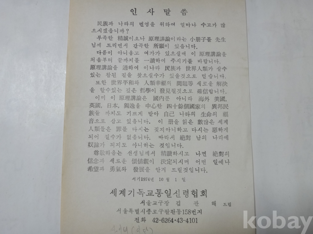 원리강론 소책자 일독 안내문 - 세계기독교 통일신령협회 (1974년)