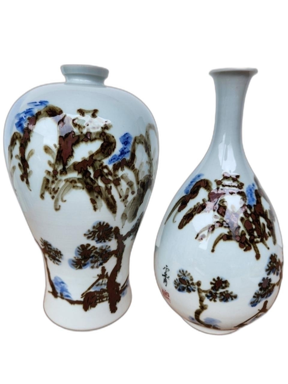 운보 산수 그림이 있는 매병, 주병 도자기 셋트 입니다.