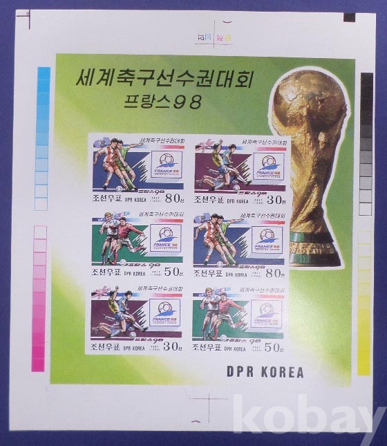북한 발행 우표 [세계축구선수권대회 프랑스98] 컬러프루프*뒷면에 1998.3.1. 조선우표사 담당자의 사인이 들어있다