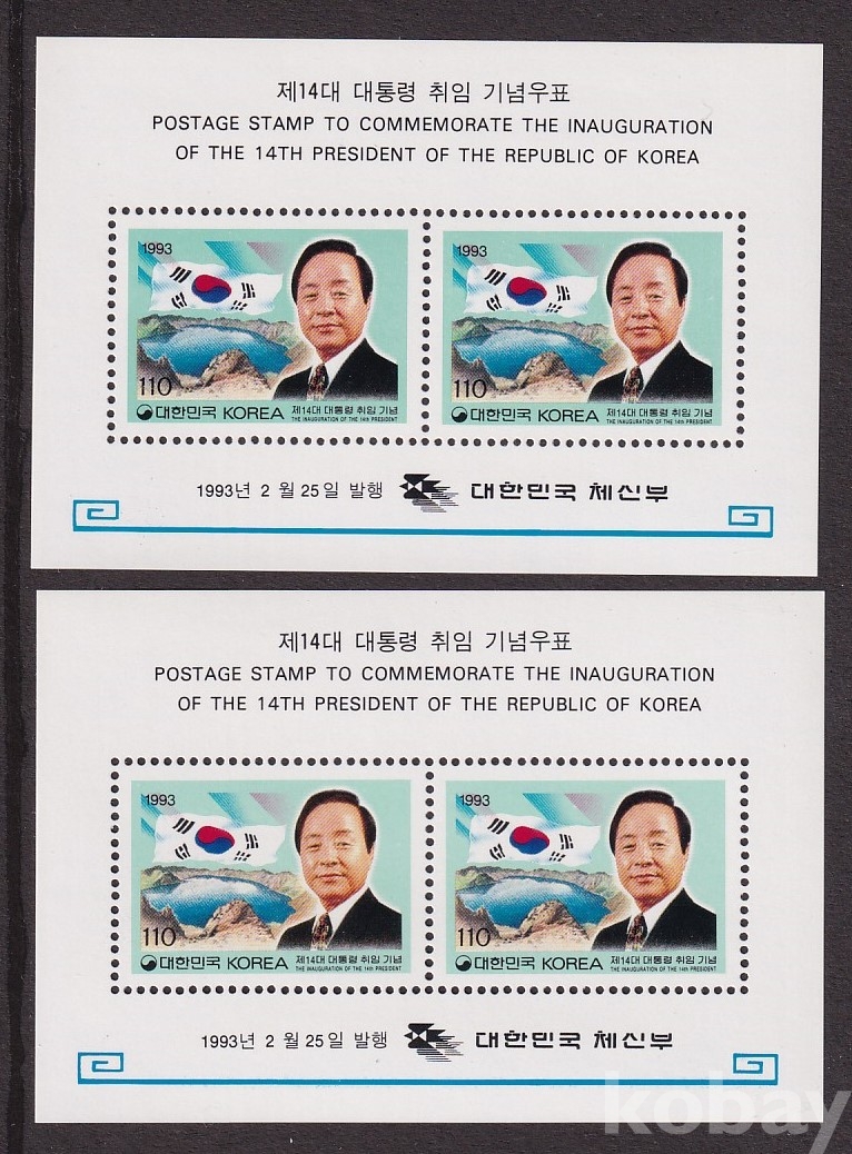 - 미사용 1993년 제 14대 김영삼 대통령 취임 기념우표 시트 2매 일괄