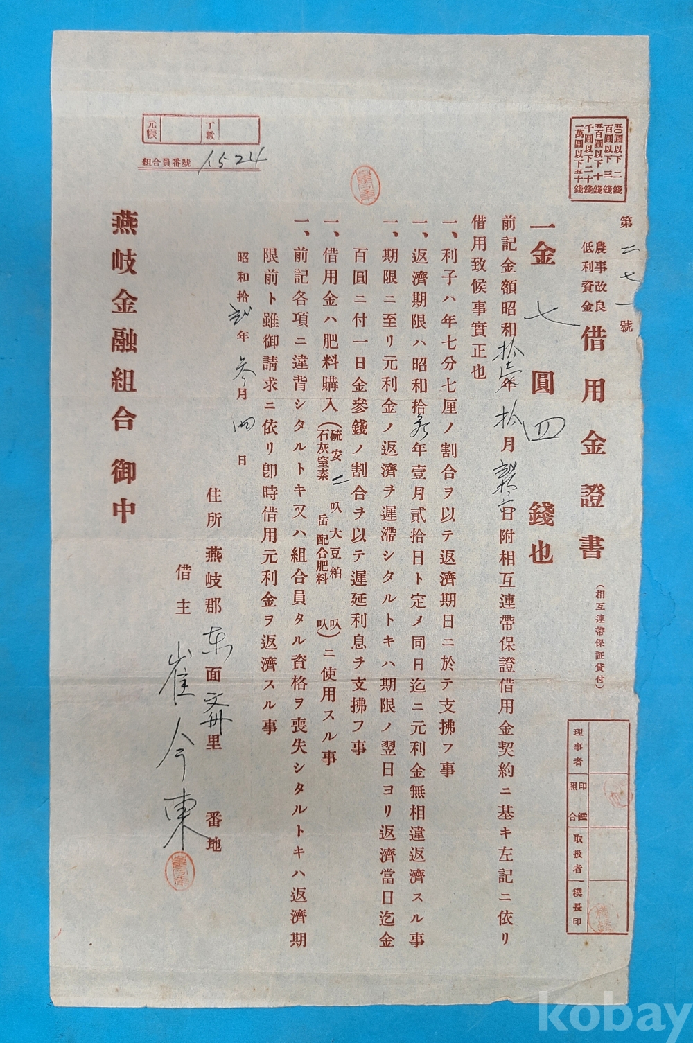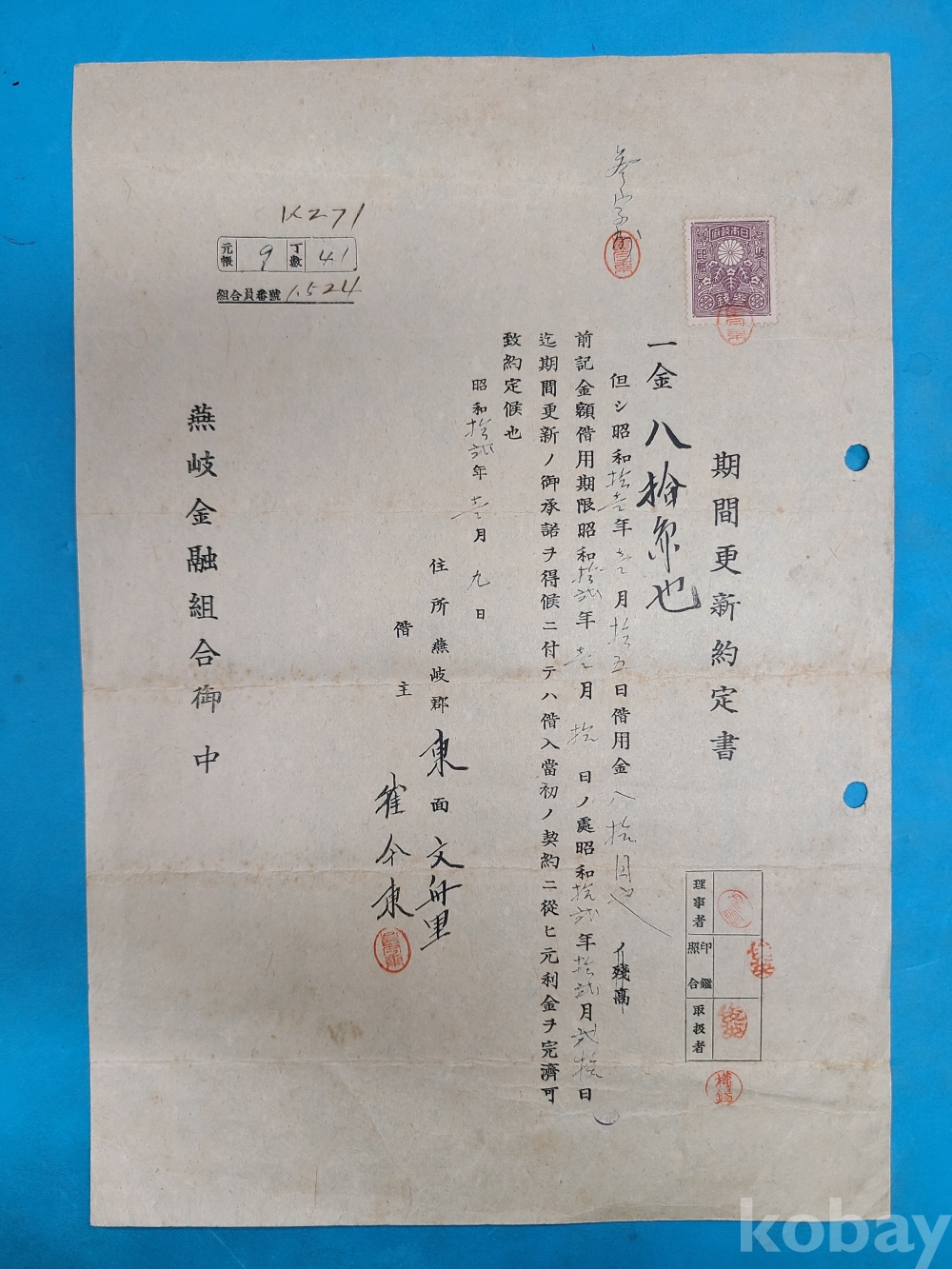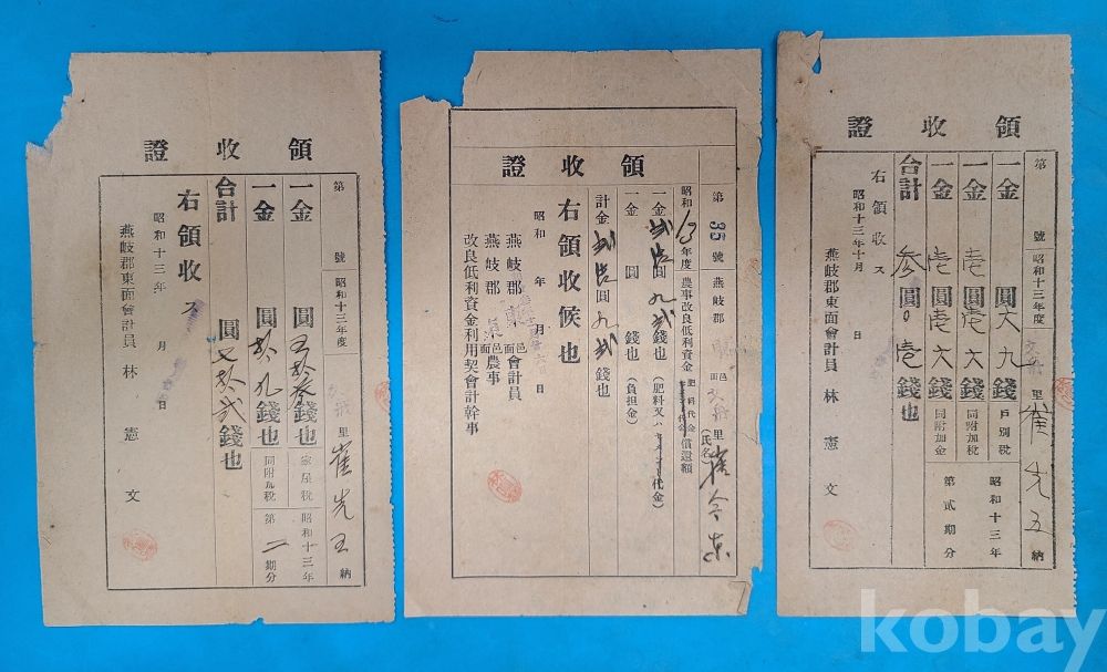 일제강점기 燕岐郡 東面 崔今東 자료 연기금융조합 차용금증서,기간갱신약정서,영수증 등