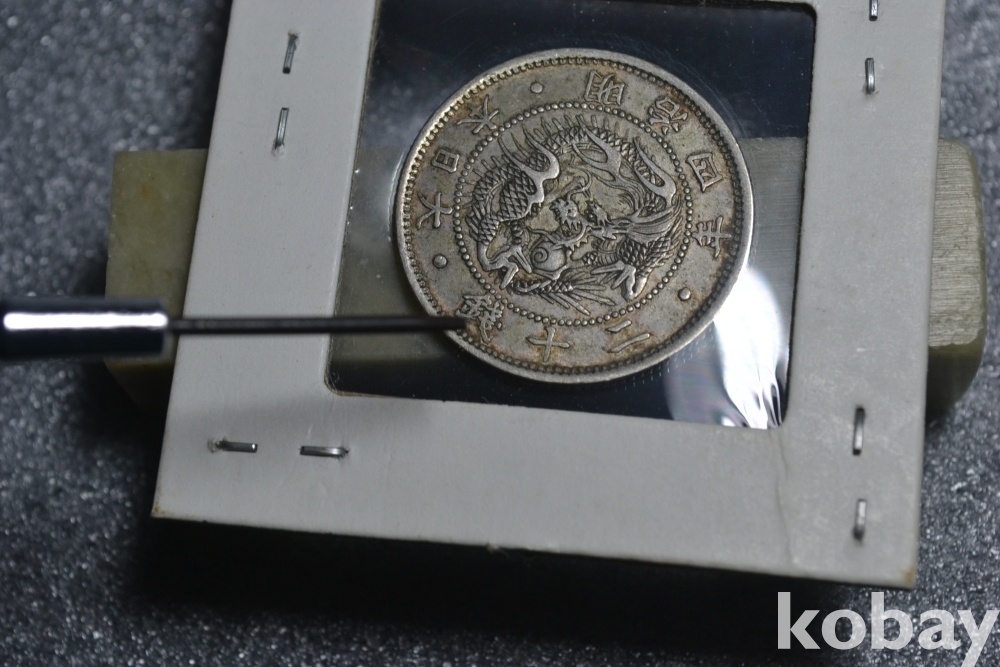 " 결전,흠전(欠錢) " 은 글자에서 " 錢 " 자에 아래쪽 끝부분 삐져나온 삐침부분이 아예 극인으로 안찍힌 상태의 욱일20전 은화 종류 입니다. (검은핀으로 가르킨 부분 사진참조)