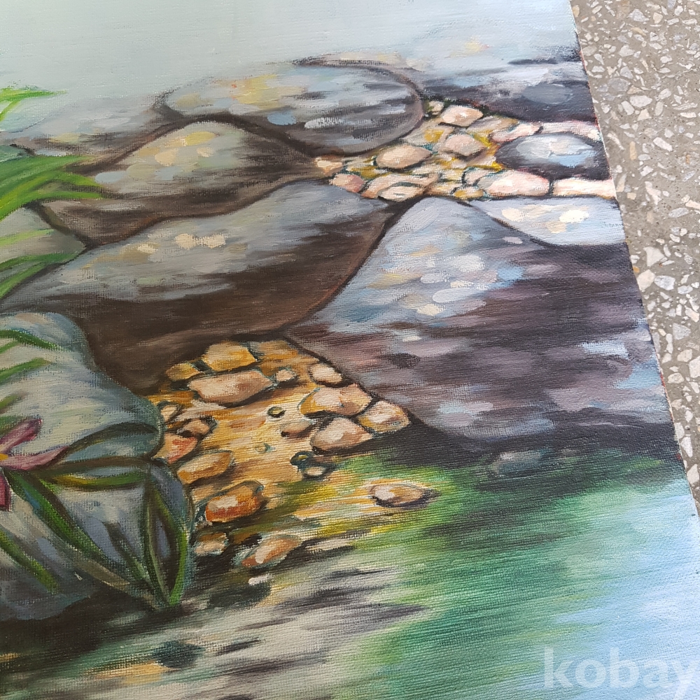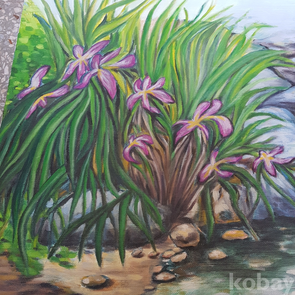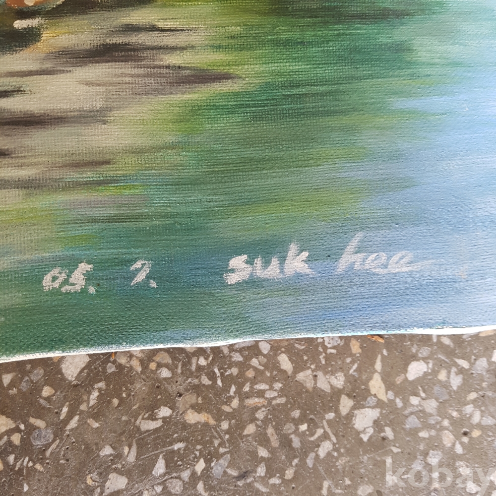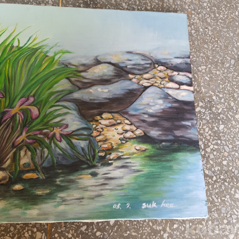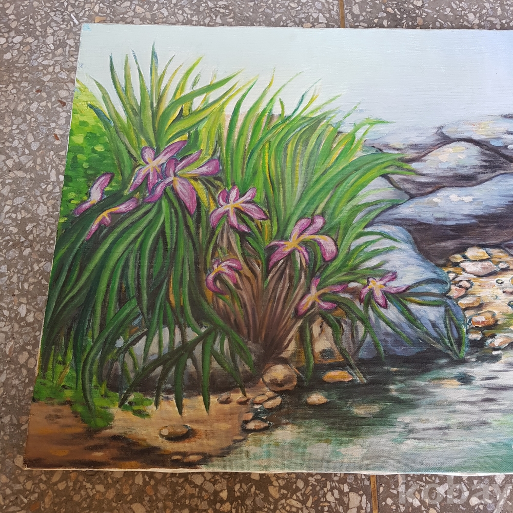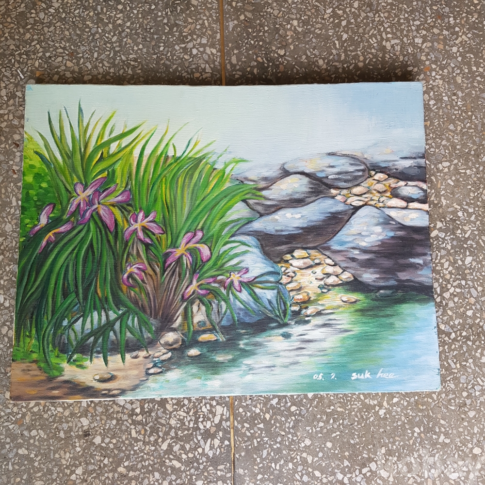 개울가의 꽃그림 유화1점 입니다