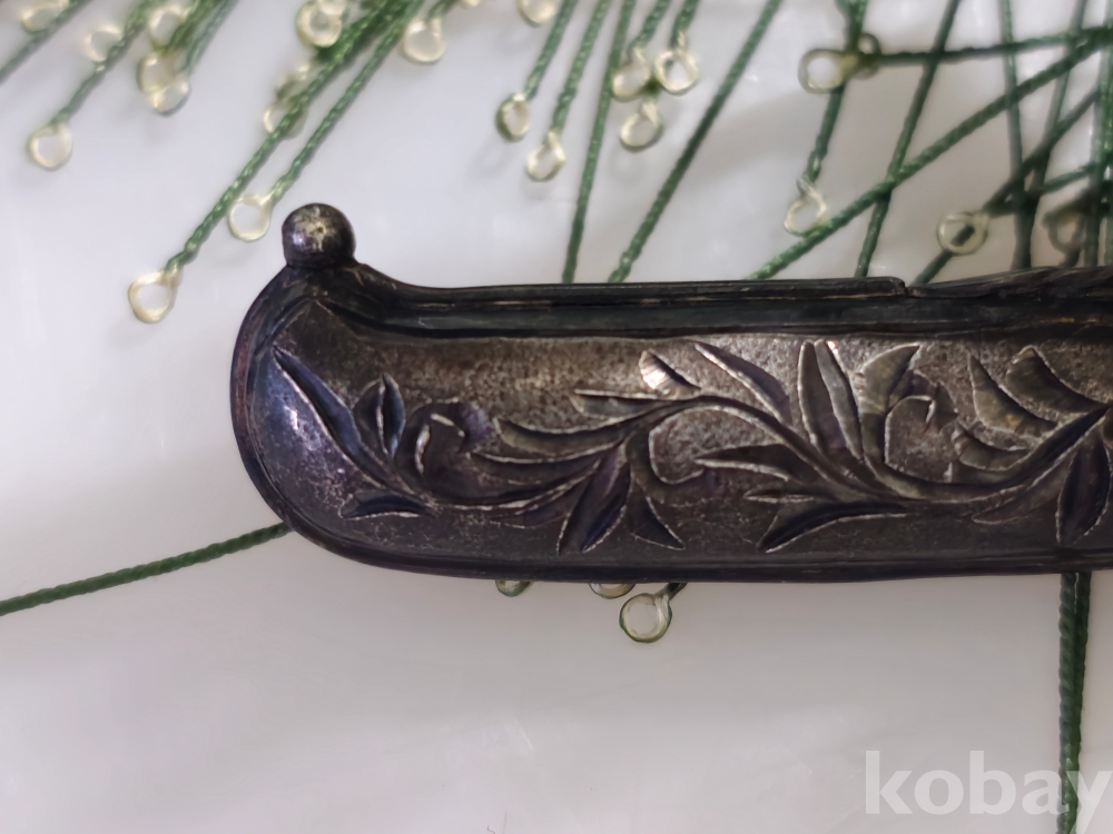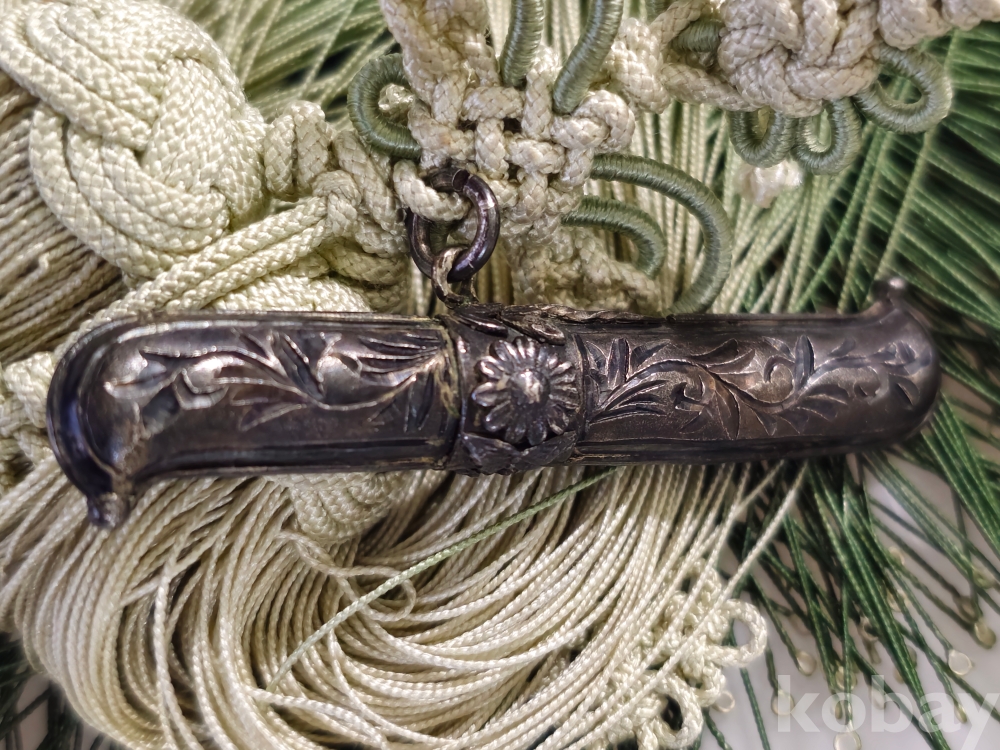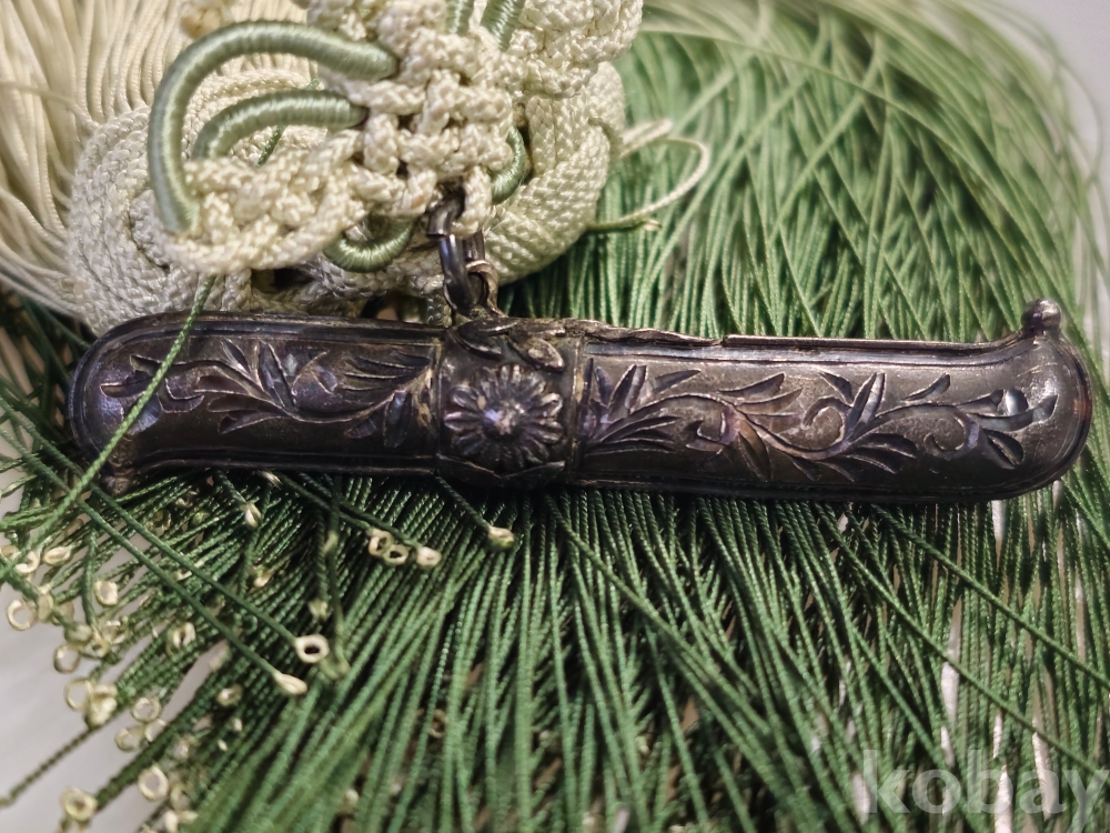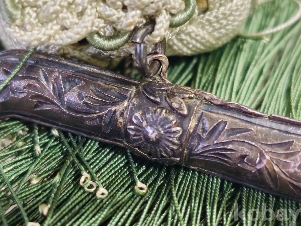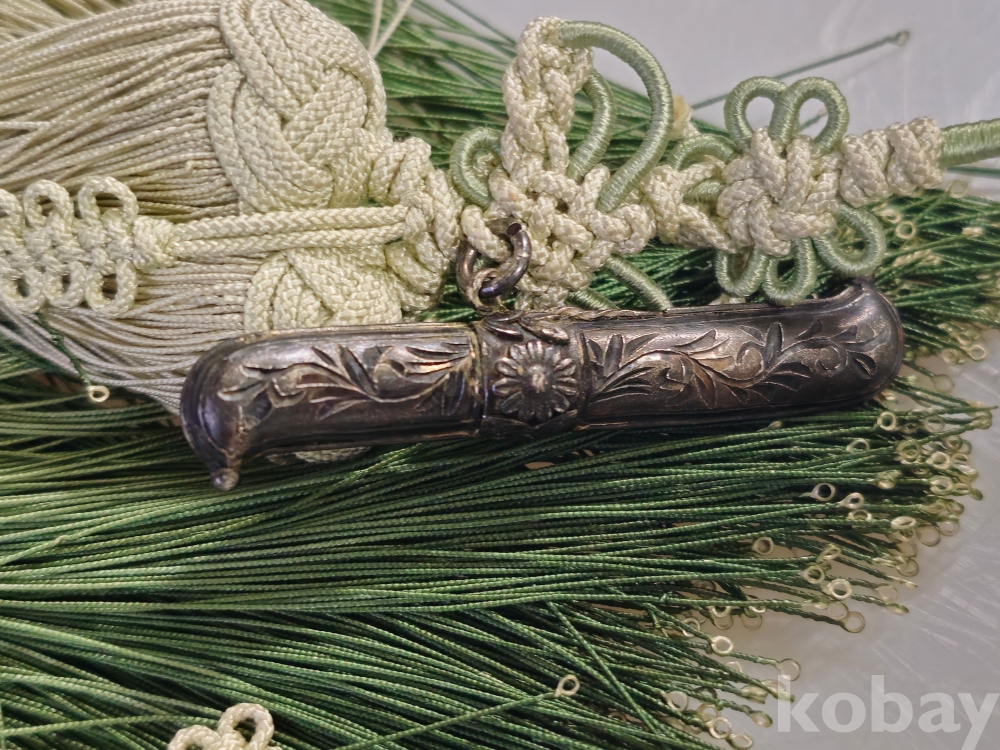 상품 설명 | 연대감 좋은 순은장도 음양각 초화문 노리개입니다. 수리없이 상태양호하며 음각으로 초화문을 시문하여 기물의 격을 높였습니다. 맨 끝의 사진은 은시약을 한 사진입니다. 참고로 사진은 확대한 상태이며 설명 못한 부분은 사진으로 대체합니다. 흔한 기물이 아니기에 소장의 가치가 높습니다. | ||
