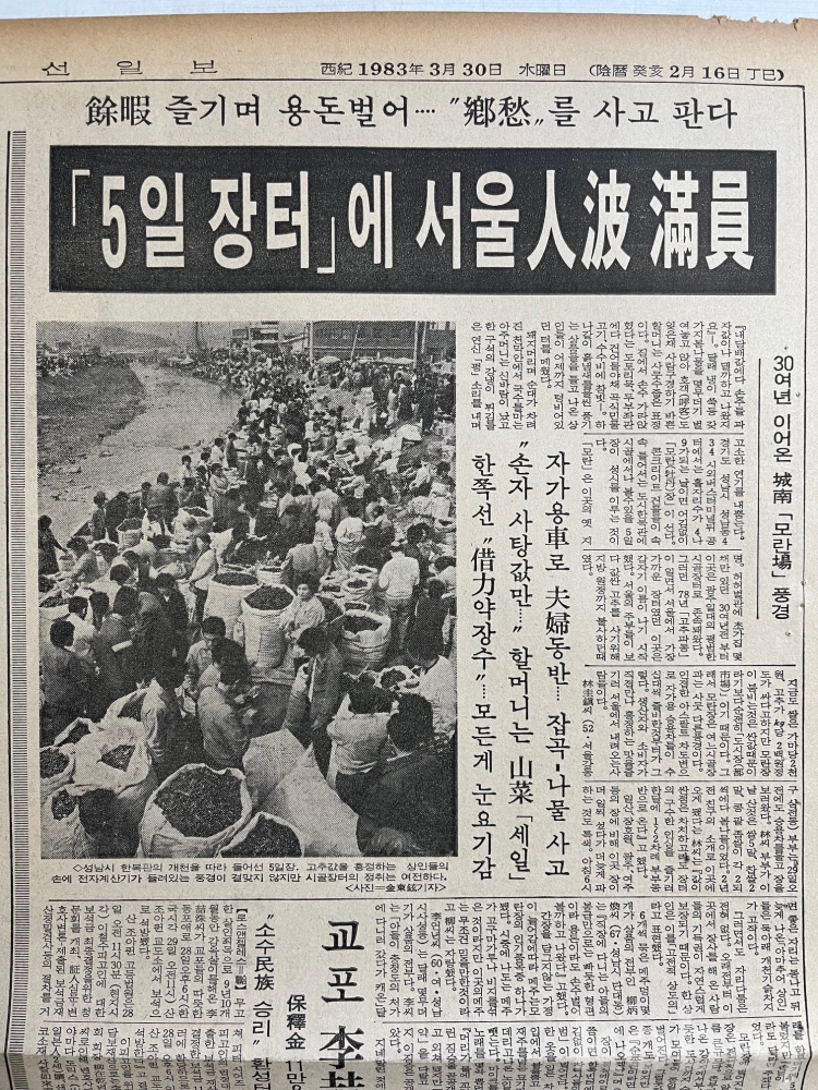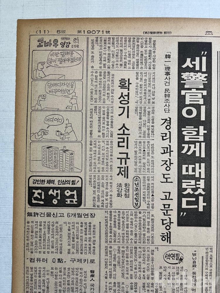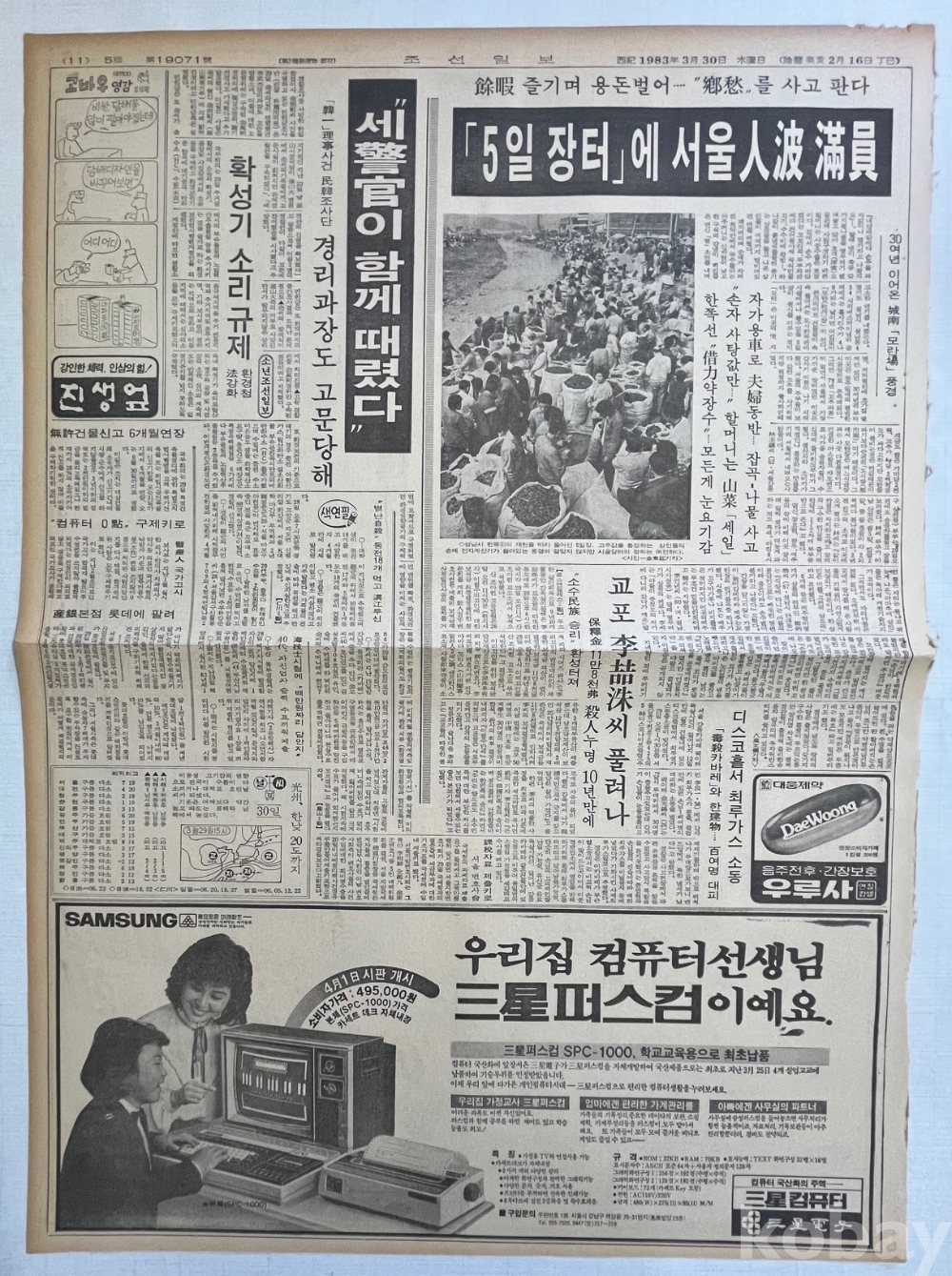 SPC 1000 삼성컴퓨터 광고가 실린 조선일보 낱장입니다. 상단에 고바우영감 연재만화와 성남 모란시장 관련기사 있습니다.