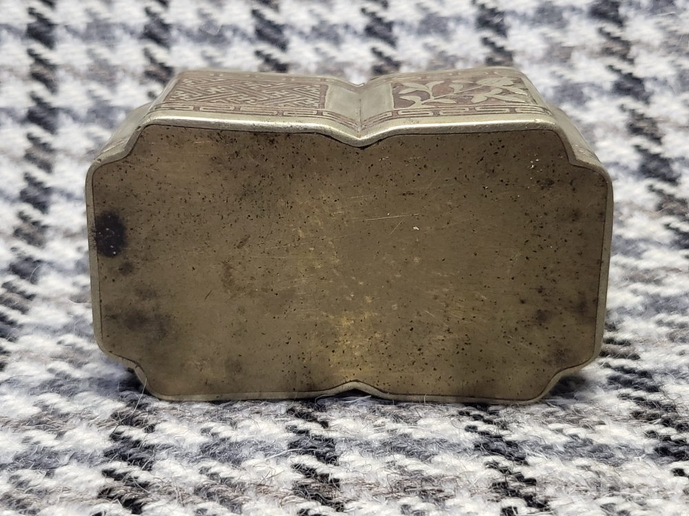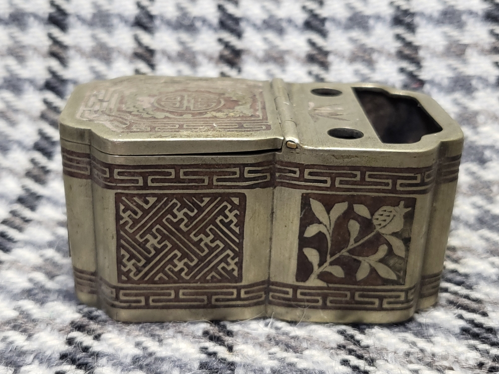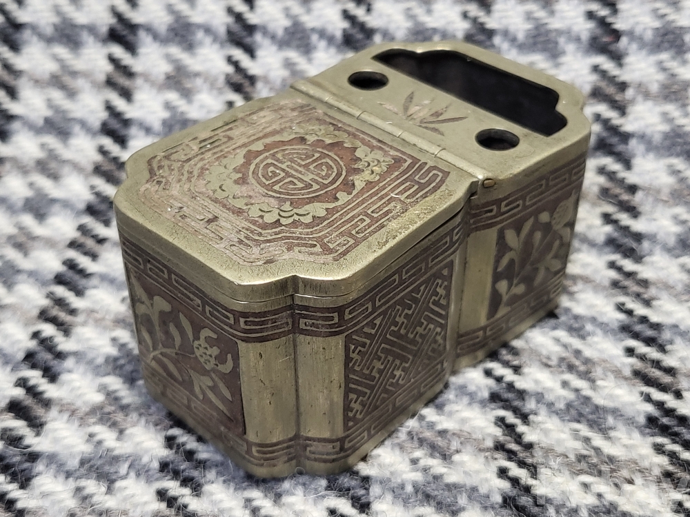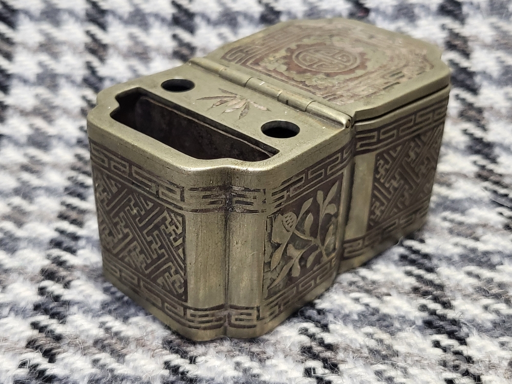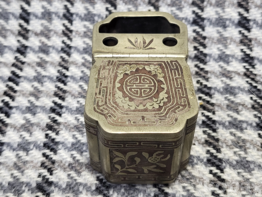 초화문과 뇌문, 목숨수자문이 동체전체에 은상감기법으로 꽉들어찬 아름다운 백동제 먹물통입니다.