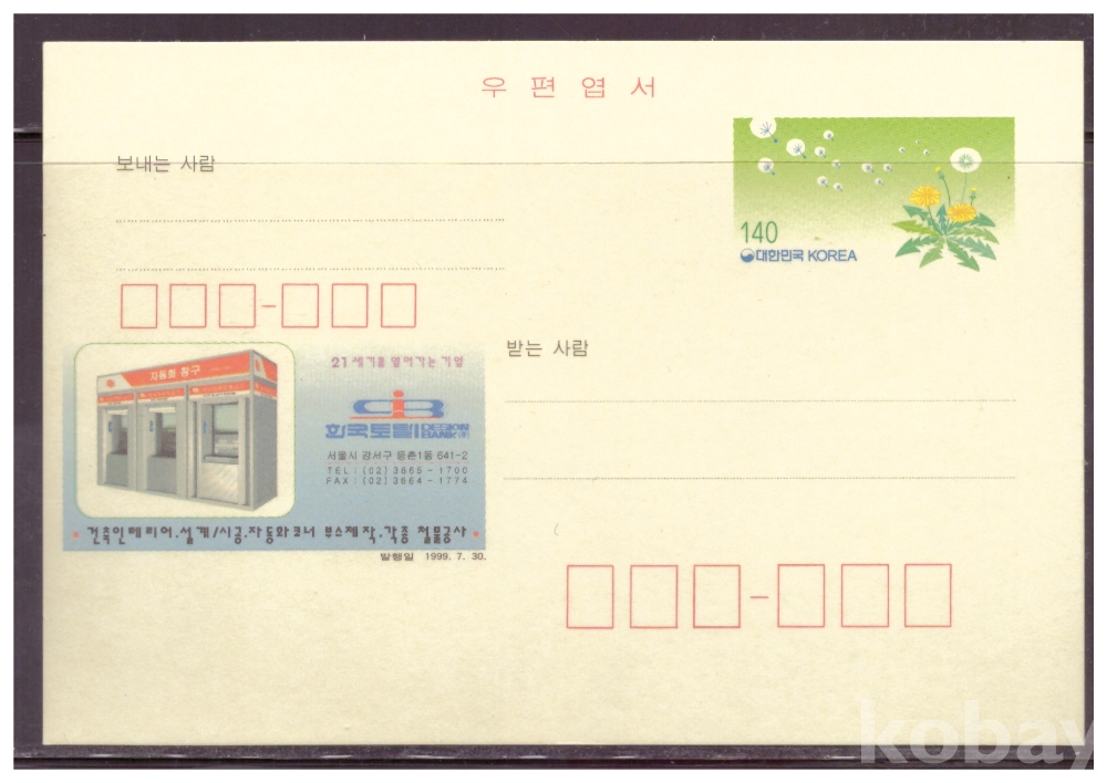 (광고엽서) 1999.7.30 지방판 LAPC354 한국토탈디자인뱅크(민들레 140원)