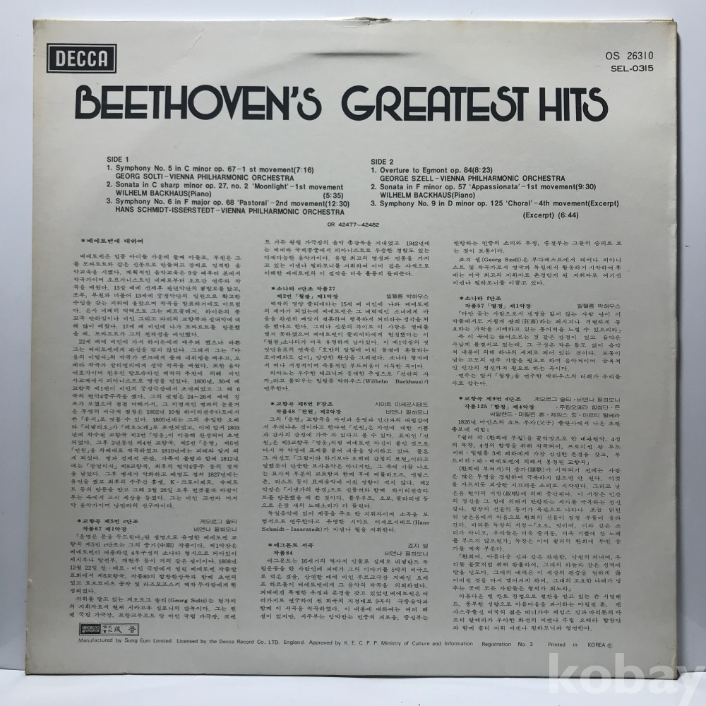 LP 82,350-58 BEETHOVEN'S GREATEST HITS . 자켓 EX 알판 EX 76 년제작 국내반