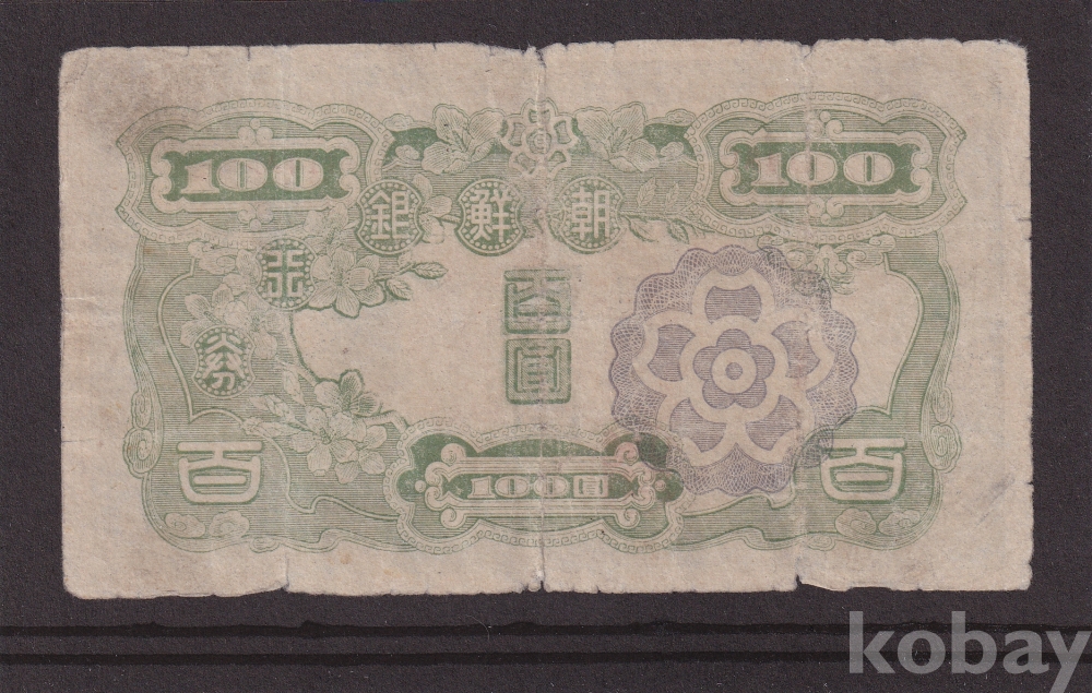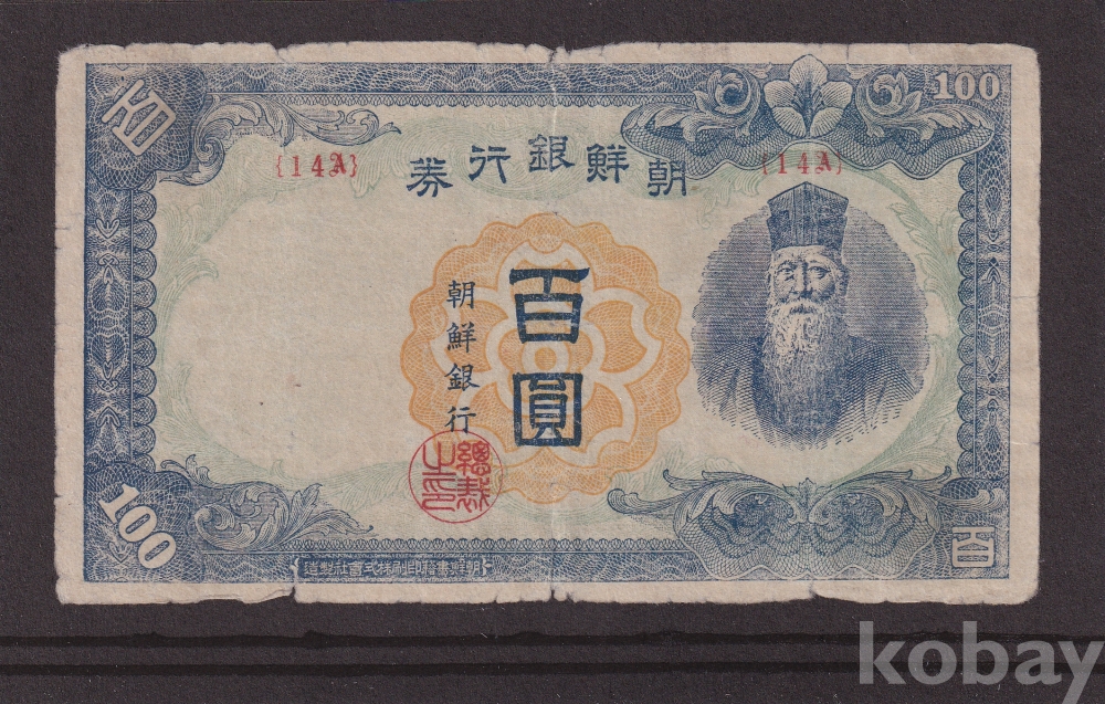 - 조선은행 1947년 무백원 판번호 14A 사용제 지폐