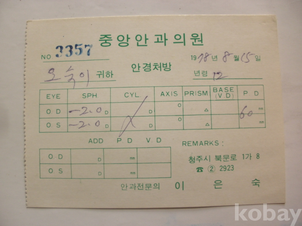 청주시 북문로 - 중앙안과의원 안경 처방 (1978년)