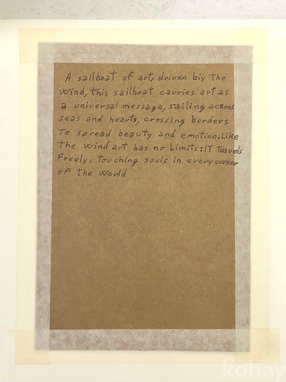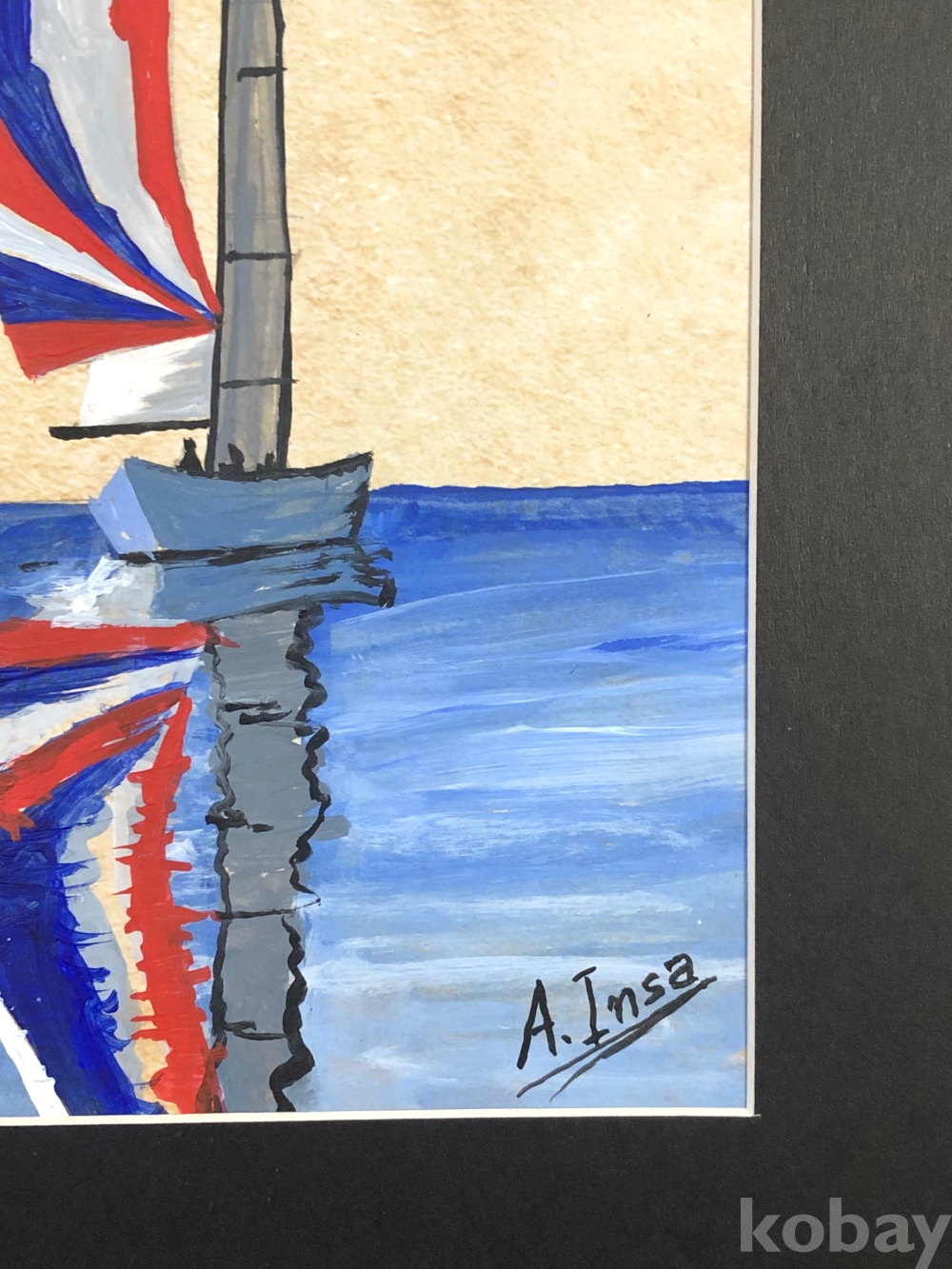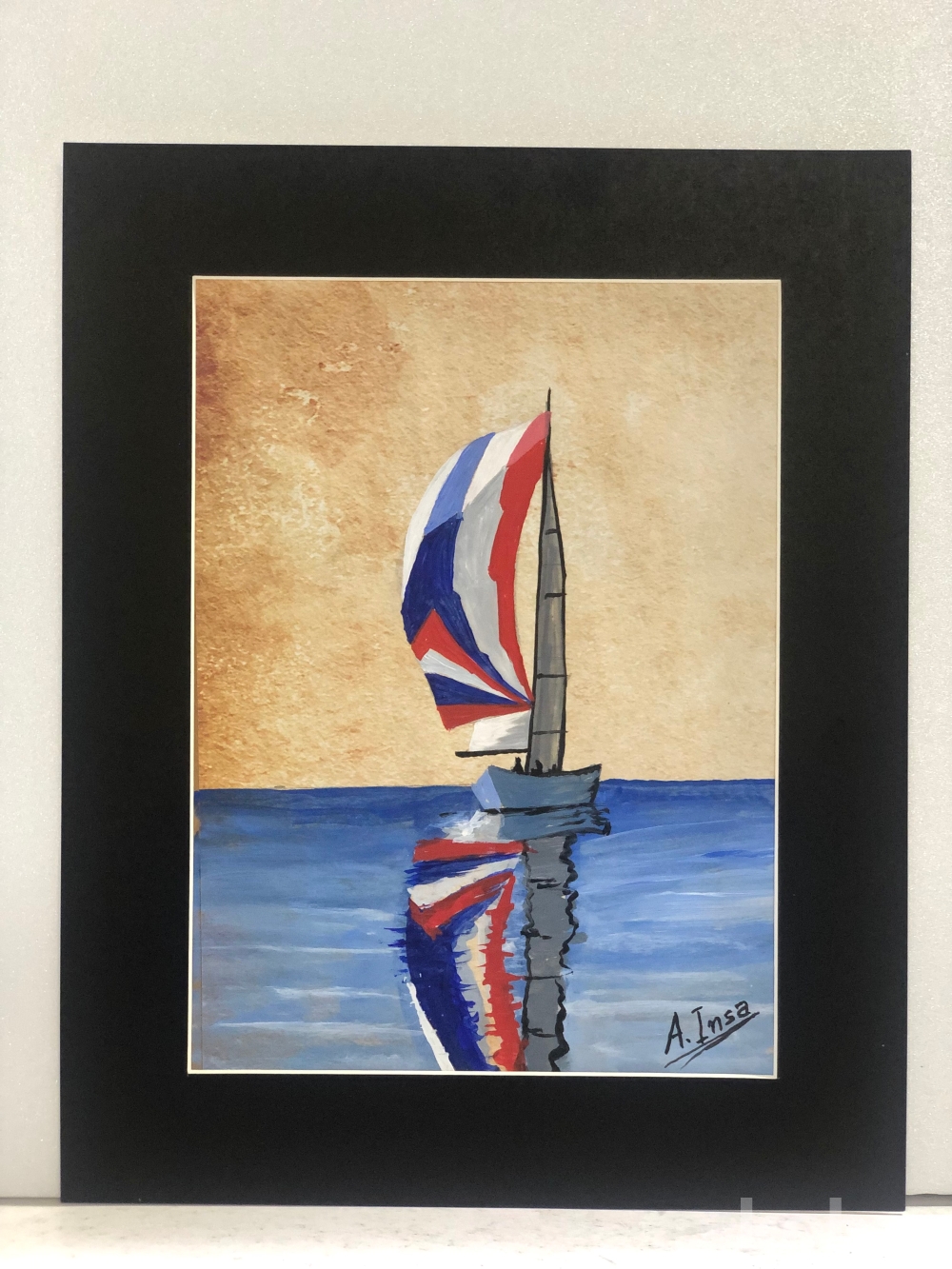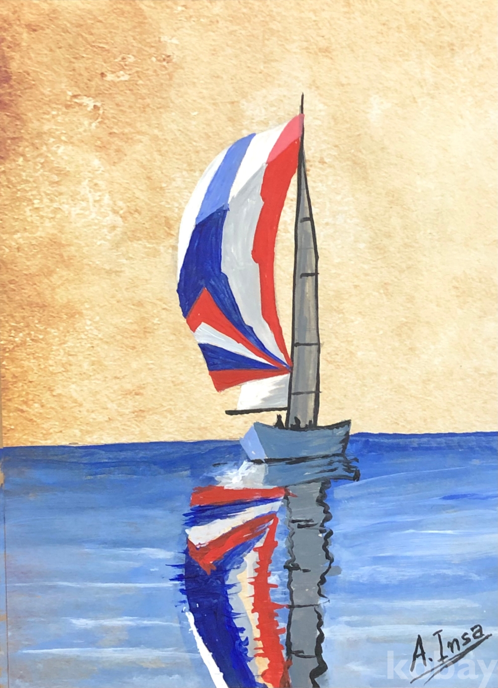 붉은색과 푸른색의 돛이 곡선으로 어우러져 바다 위에 부드럽게 반사된 모습의 작품입니다.