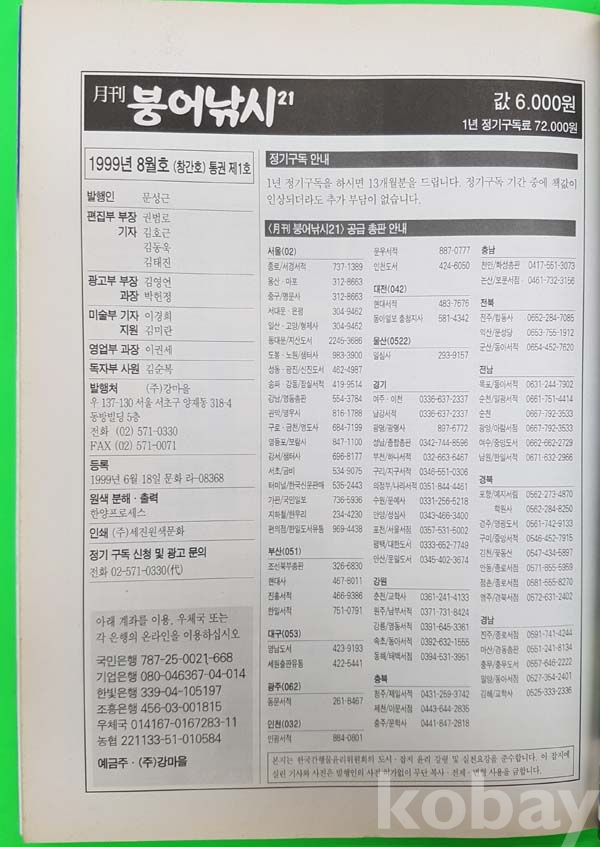 [창간호] 月刊 붕어낚시* ㈜ 강마을,1999.8,249p