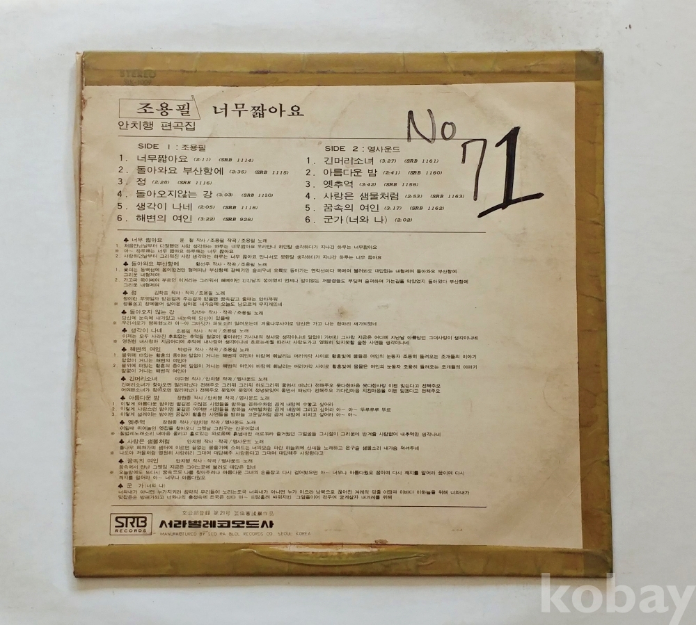 | 자켓상태 | VG : 주름, 접힘, 모서리 찢김 다수 | 음반상태 | EX : 재생에 영향 없는 가벼운 기스 존재 | 발매정보 | 알수없음 | 가사지여부 | 무 |