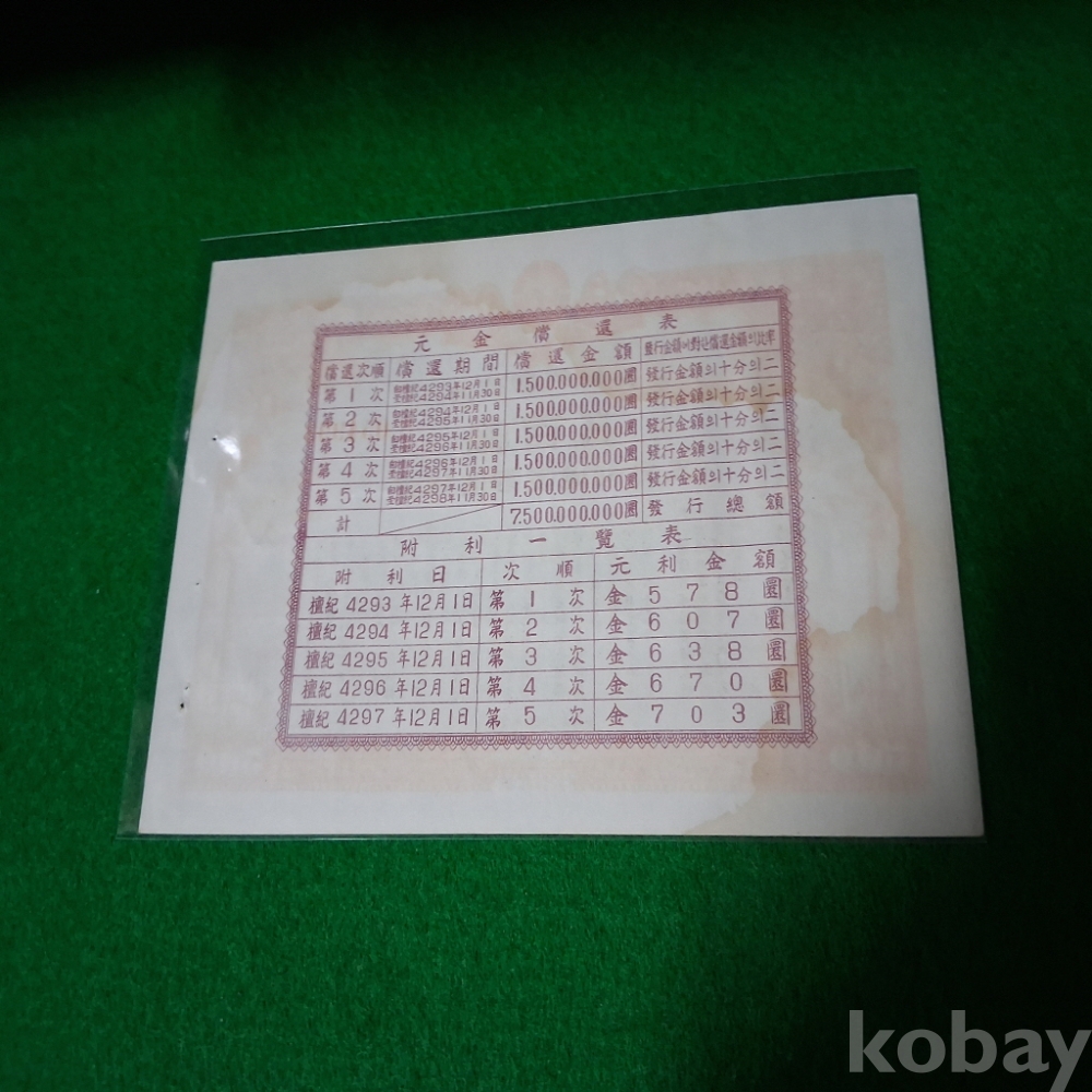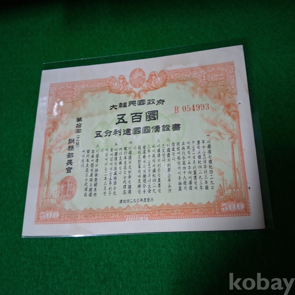 대한민국 5분리건국채권 10회 을조500환 사용제