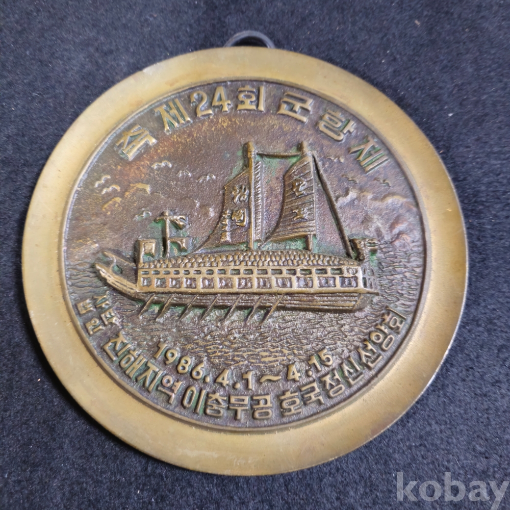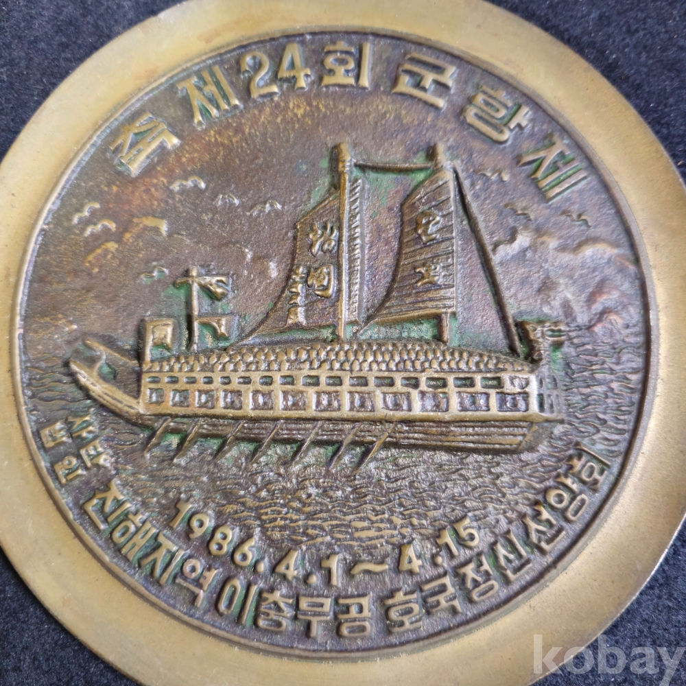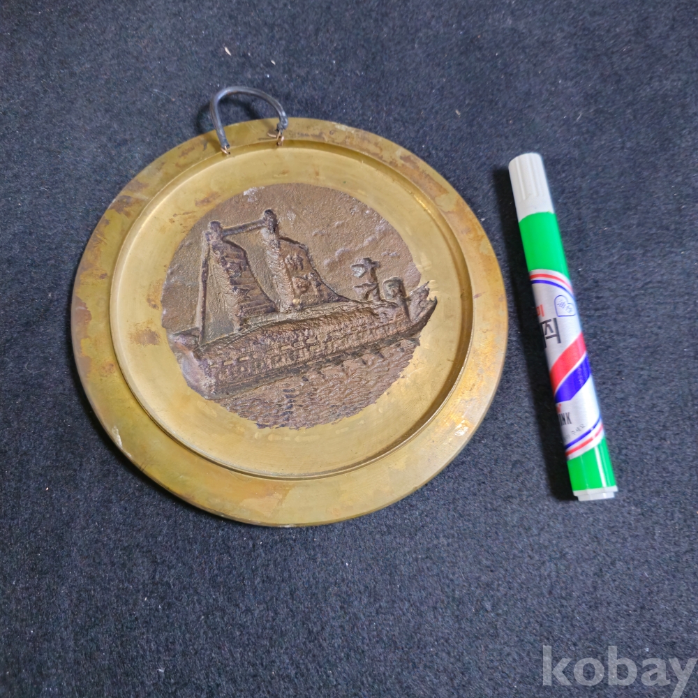 (((근현대사자료))) 거북선 양각 祝 제24회 군항제기념 벽걸이 놋쇠접시 (1986 진해지역 이충무공호국정신선양회)