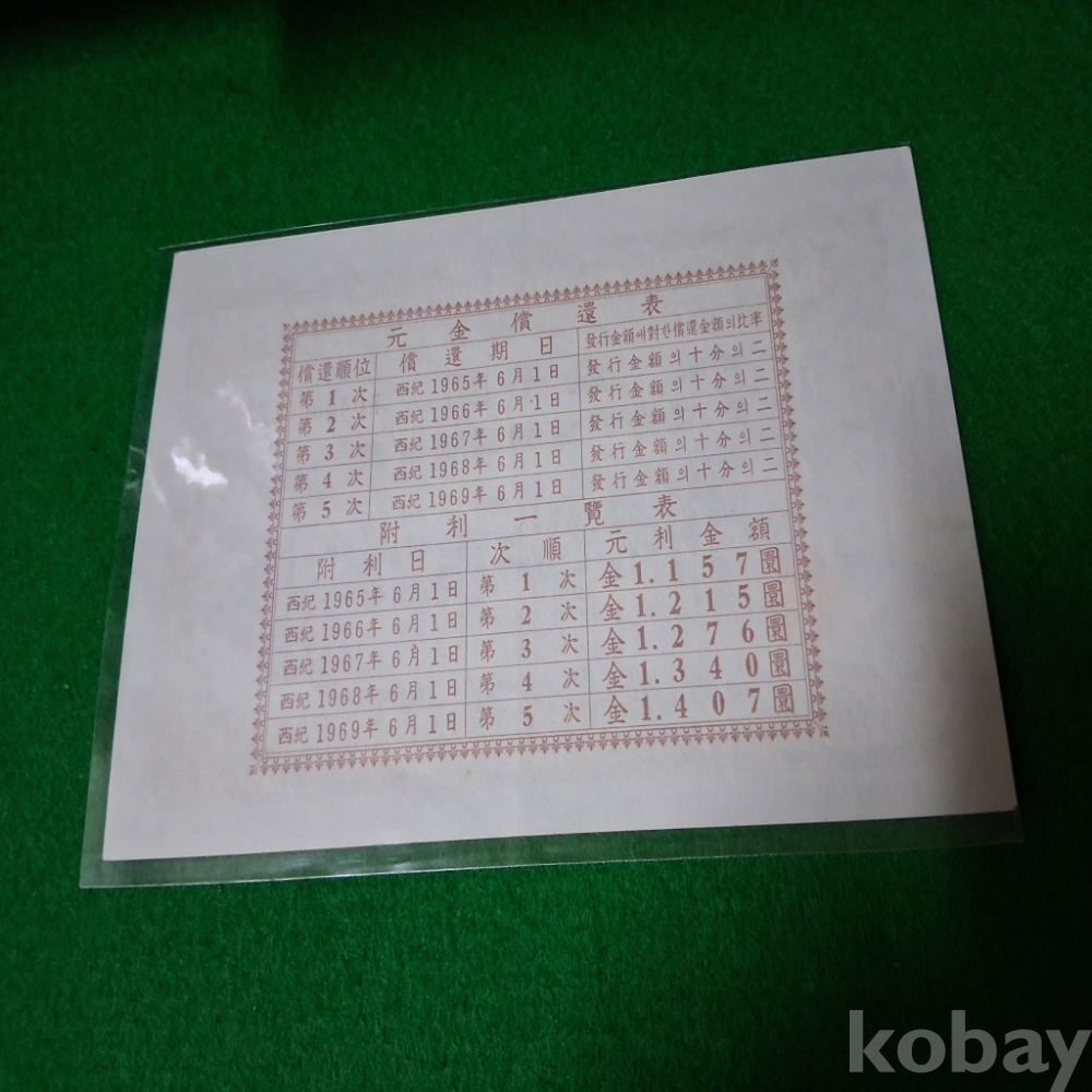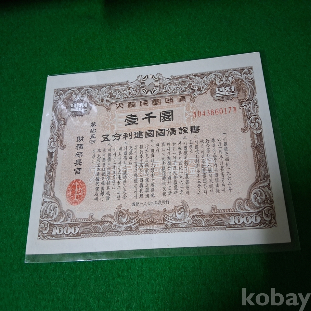 대한민국 5분리건국채권 15회1000환 사용제
