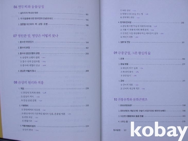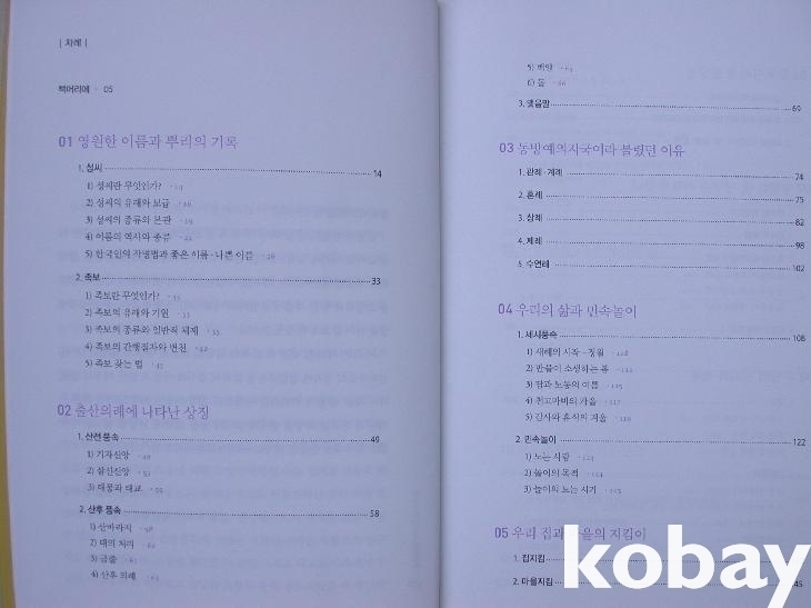 본문은 성씨나 족보, 출산의례, 관혼상제례, 세시풍속, 민속놀이, 십이지, 명당, 관상, 궁궐 등 10장으로 구성하여 서술하였고, 2도색 인쇄이다.