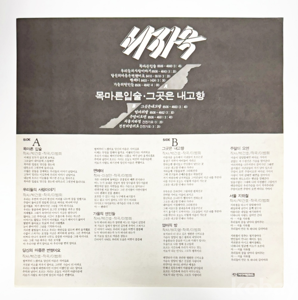 상품 설명 | Side A 1. 목마른 입술 2. 우리들의 사랑이야기 3. 당신의 마음은 변했어요 4. 팬레터 5. 가을의 연인들 Side B 1. 그곳은 내고향 2. 엄마의 방 3. 주말이 오면 4. 서울 지하철 (건전가요) 5. 천천히 달려요 (건전가요) | ||