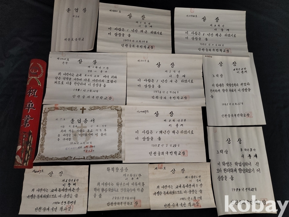 빈티지 세월 감이 느껴지는 지관통과 70~80년대 졸업장, 상장 등 12장 일괄입니다.
