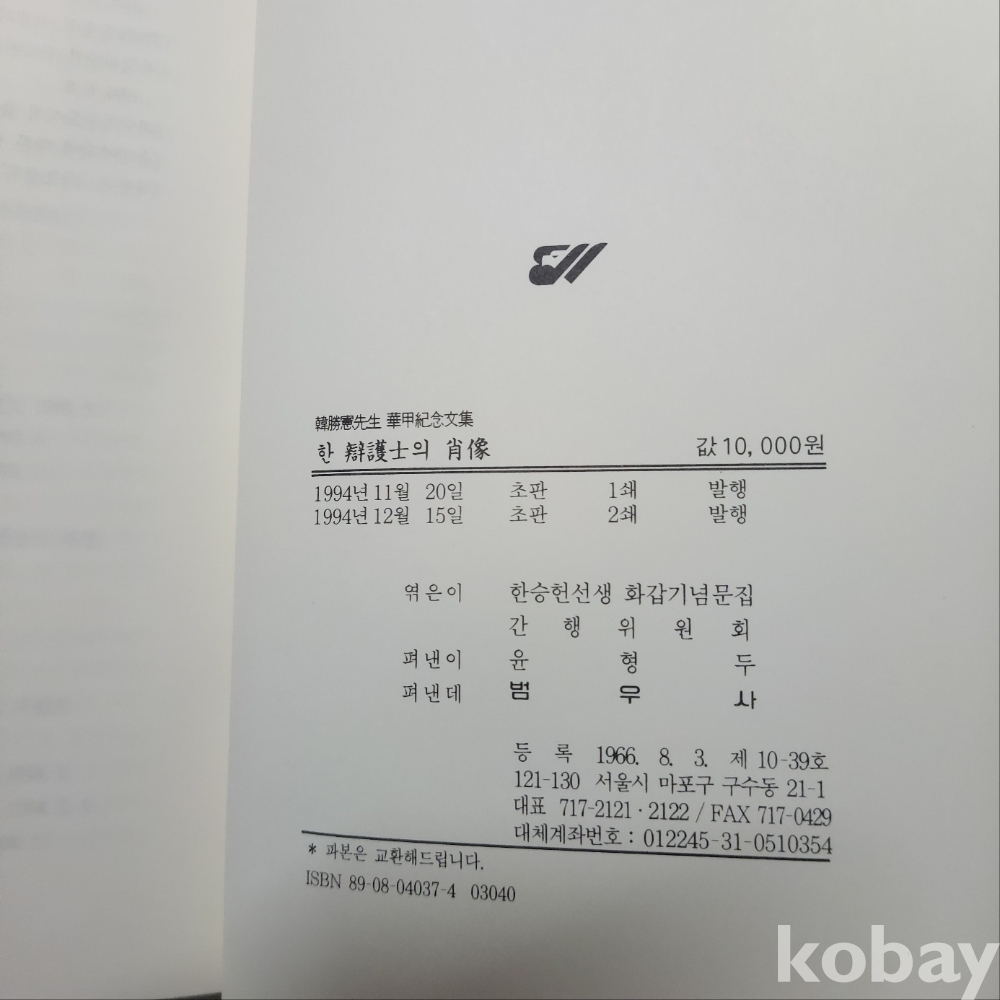 [희귀본] 한 변호사의 초상 (한승헌선생 화갑기녀문집) / 범우사 94년 초판 : 중급/서고ko06
