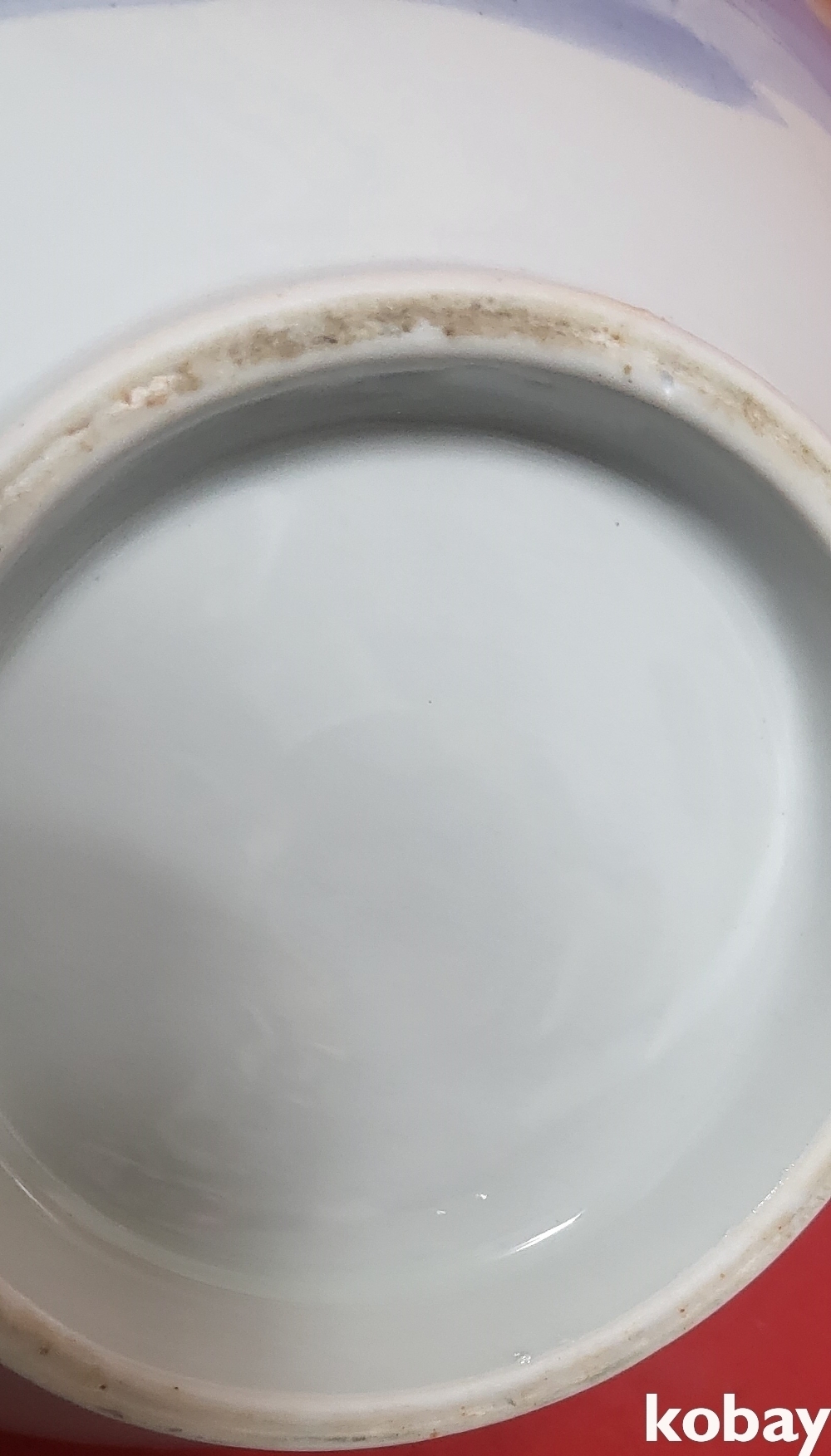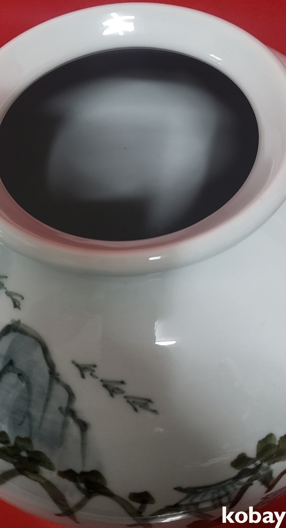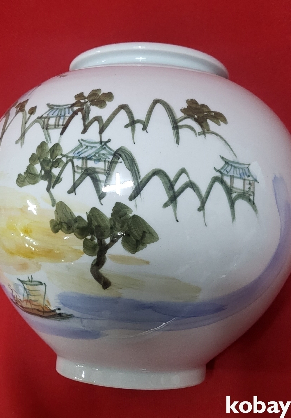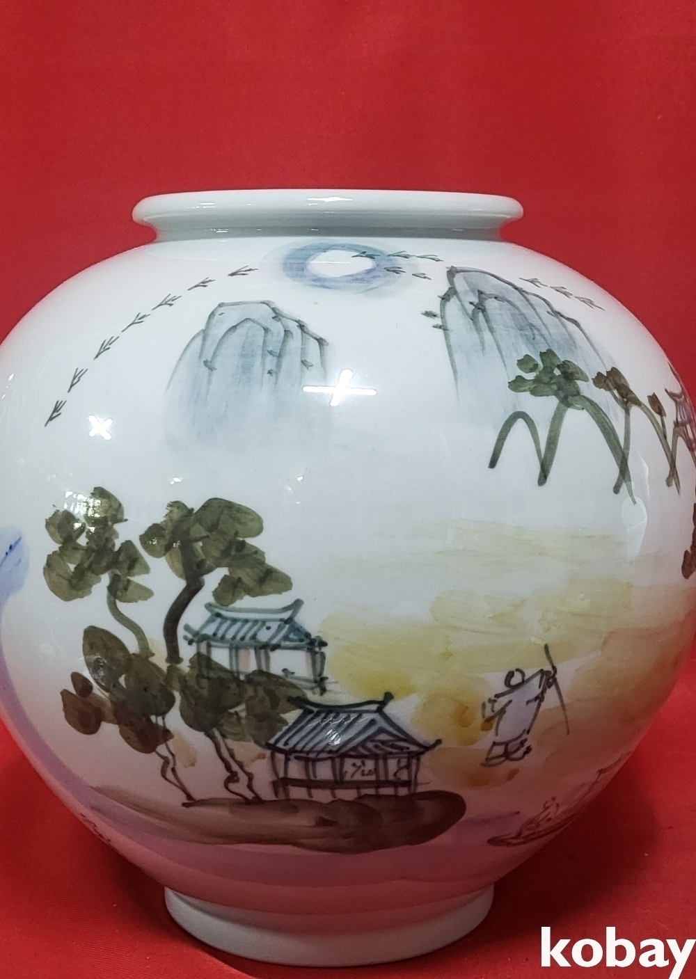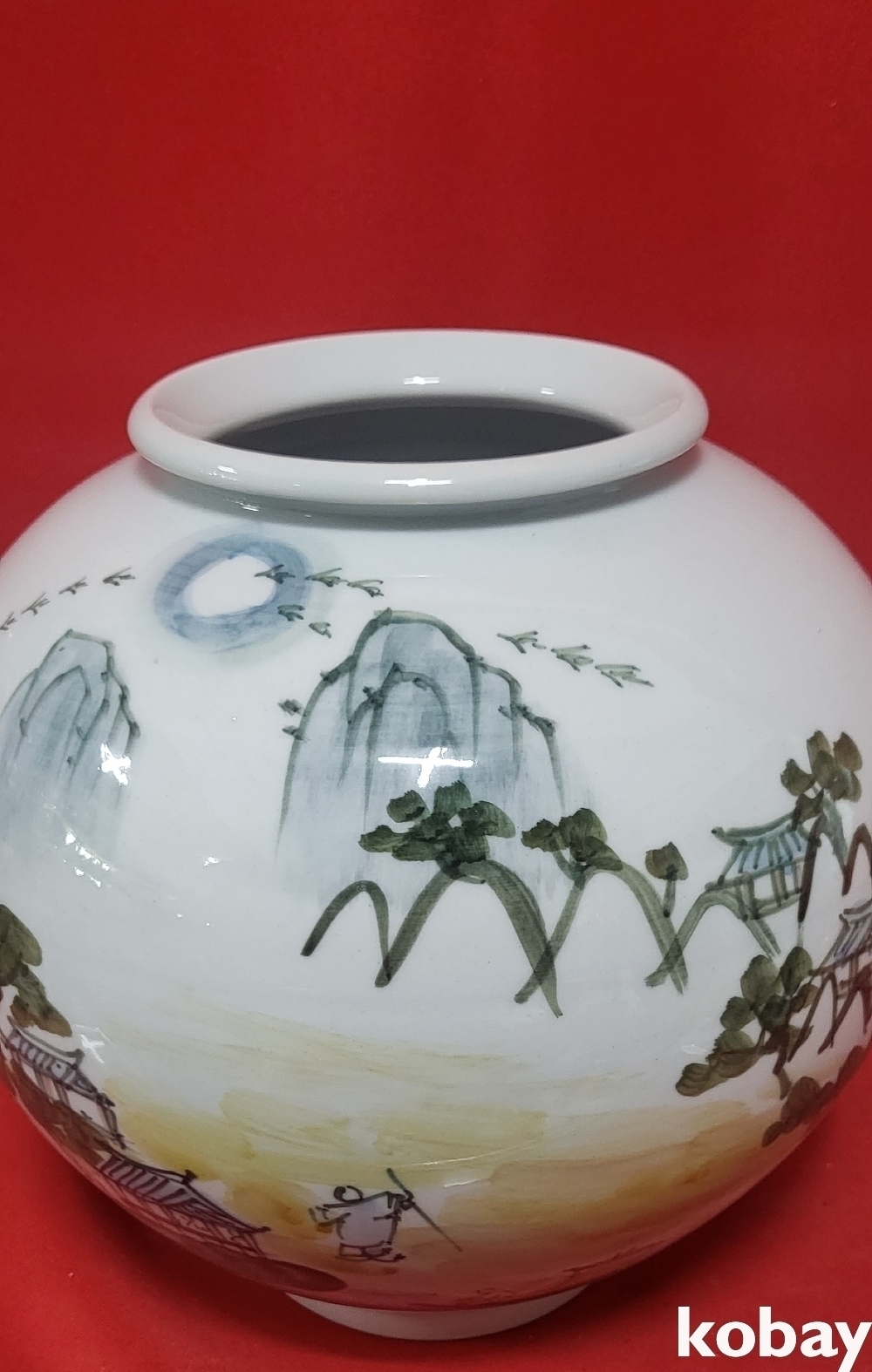 작가 수결이 보이는 산수문양 달항아리입니다,