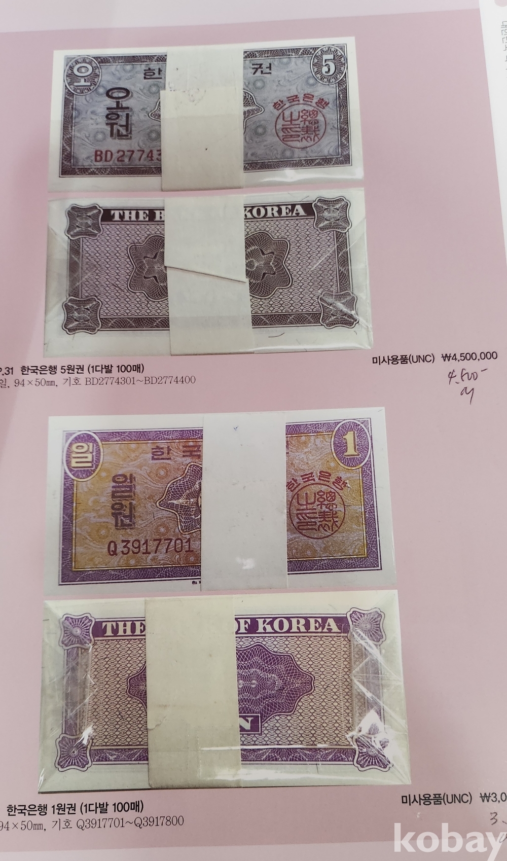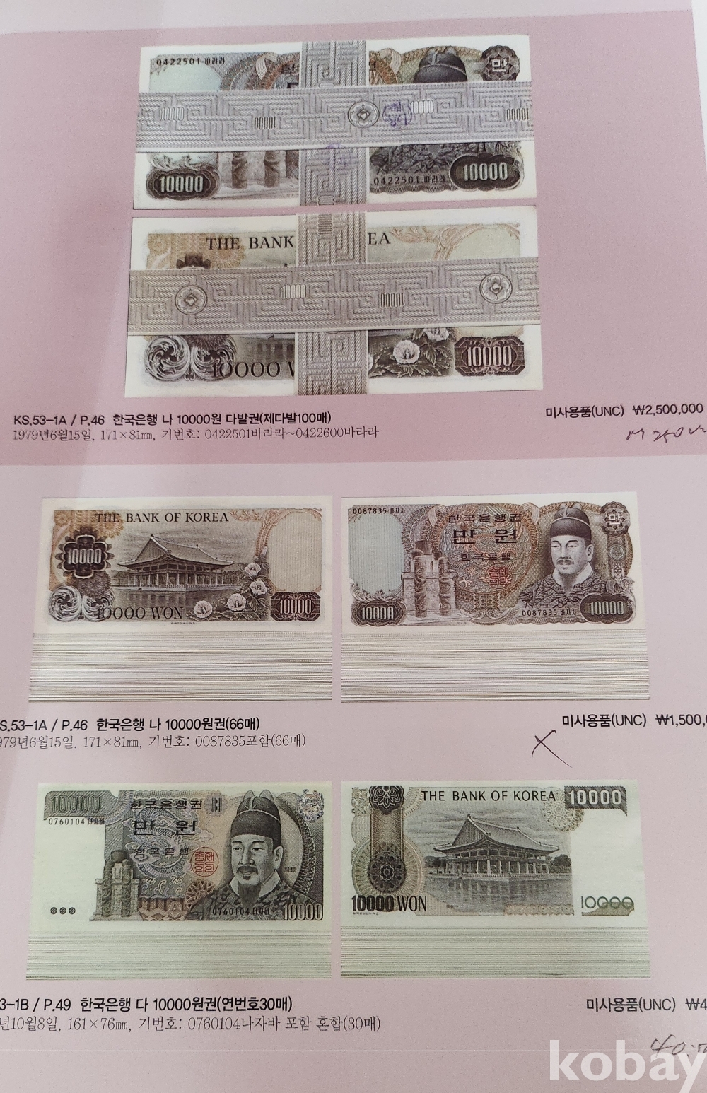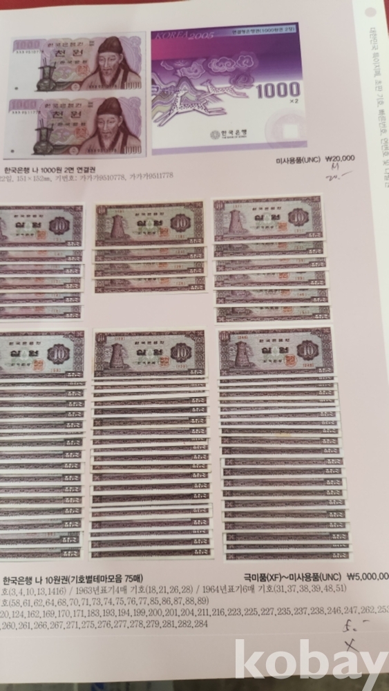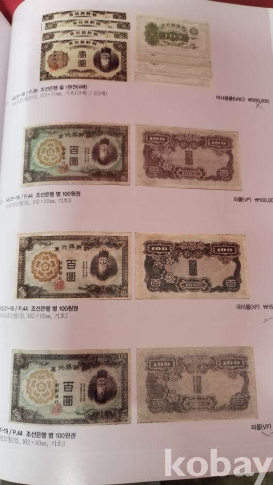 대한민국 통용권 지폐부터 조선은행권까지 다양한 지폐가 경매 낙찰 가격과 함께 수록된 도록입니다,
