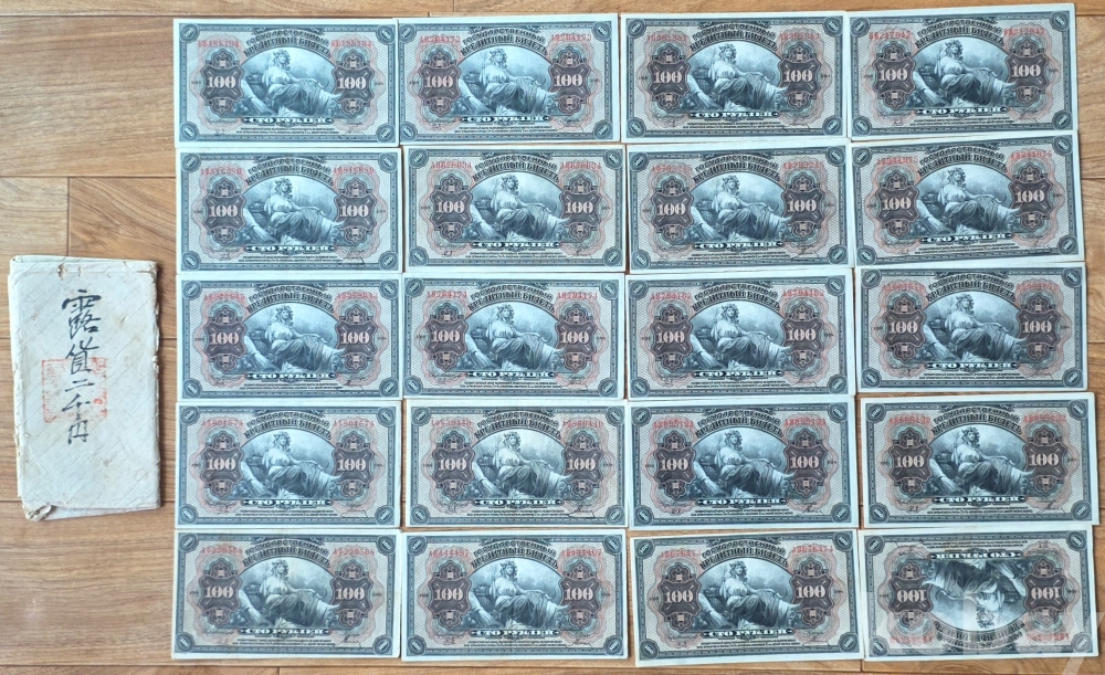 1919년 제정러시아에서 발행한 100루블 지폐 20장. 블라디보스크 지역에서 활동하던 독립운동가 집안에서 나왔을 가능성이 큼