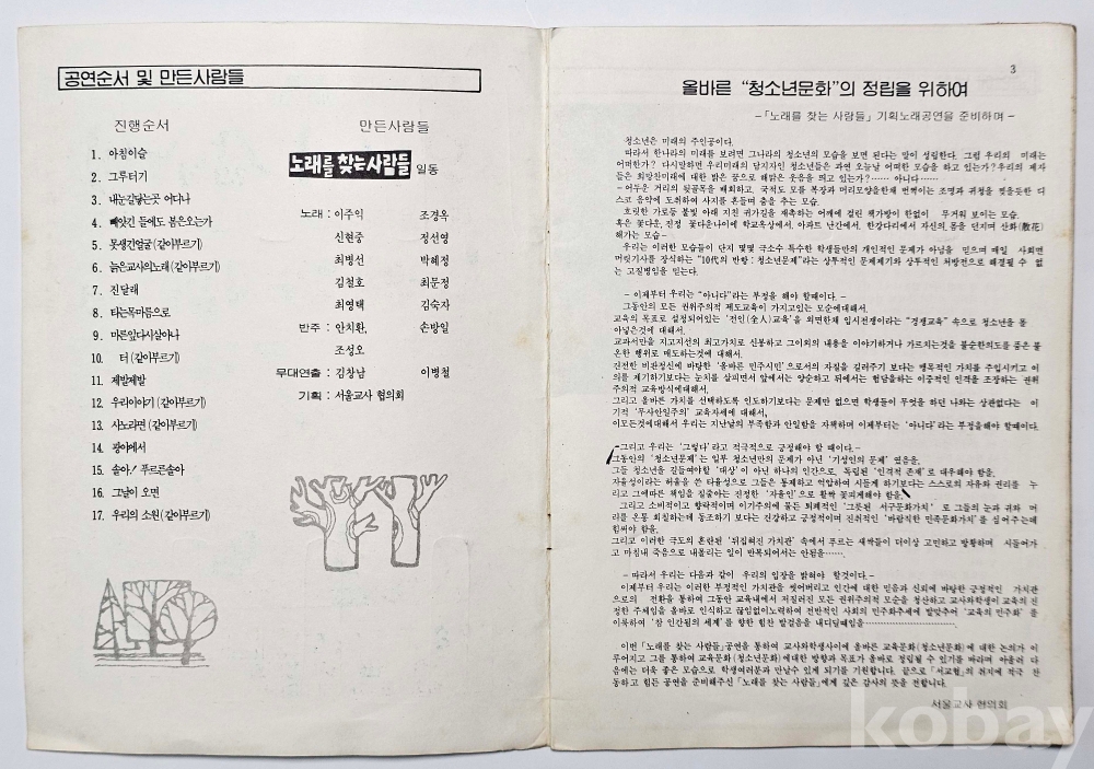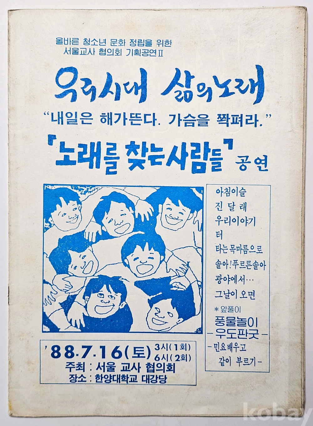 물 품 명 | 노래를 찾는 사람들 / 우리 시대 삶의 노래 노래공연 팜플렛 / 1988년 / 서울교사협의회 |