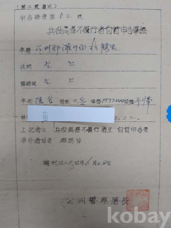 **** 1961년 공주군 "병역의무불이행자자수신고필증"/공주경찰서장