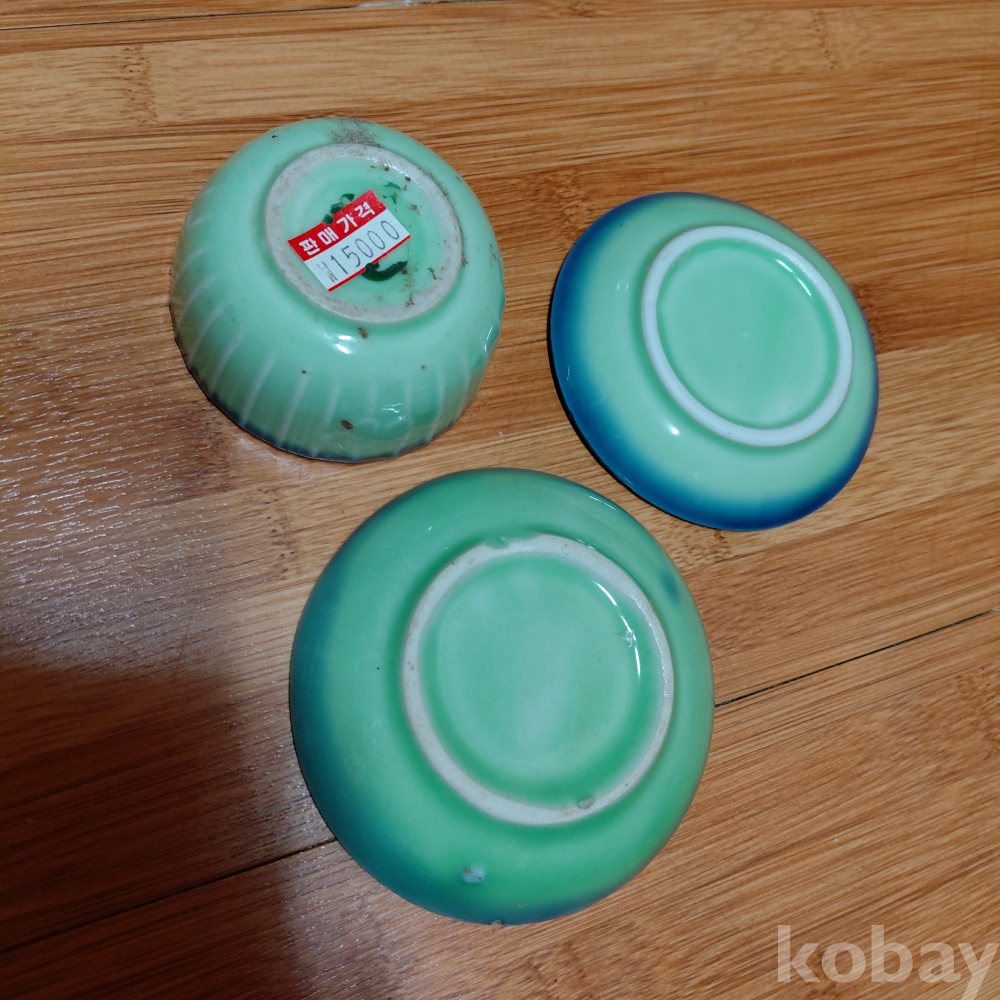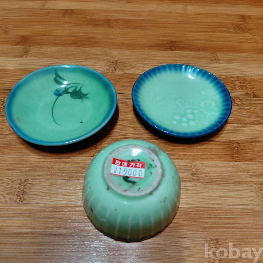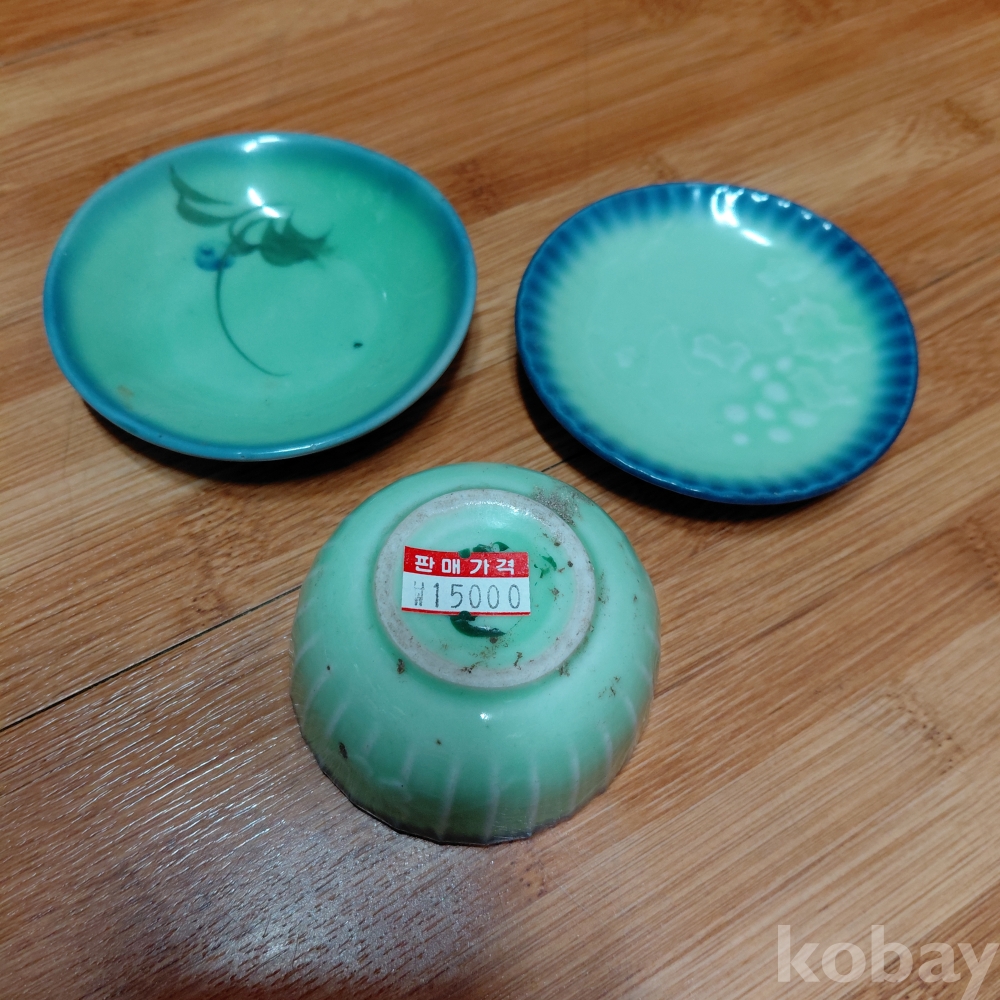 일제강점기 시대 제작사용 귀한 자료 청자도자기 잔ㆍ접시 세점 일괄 올려드립니다