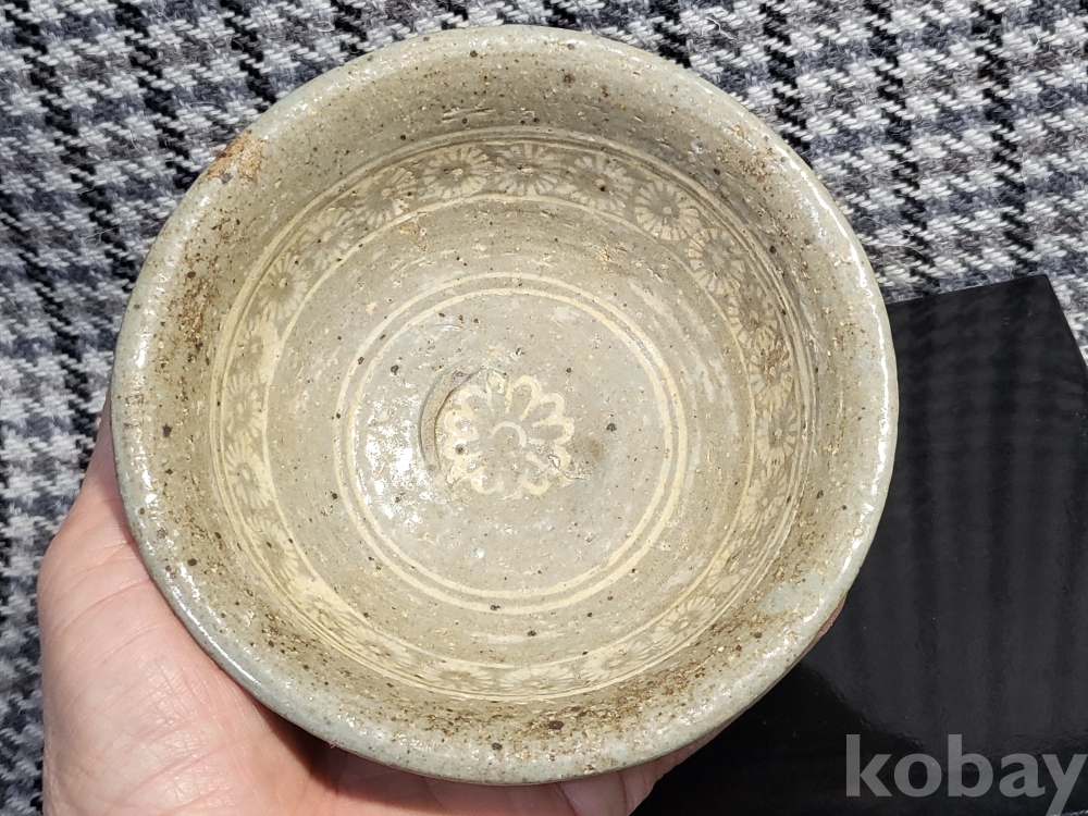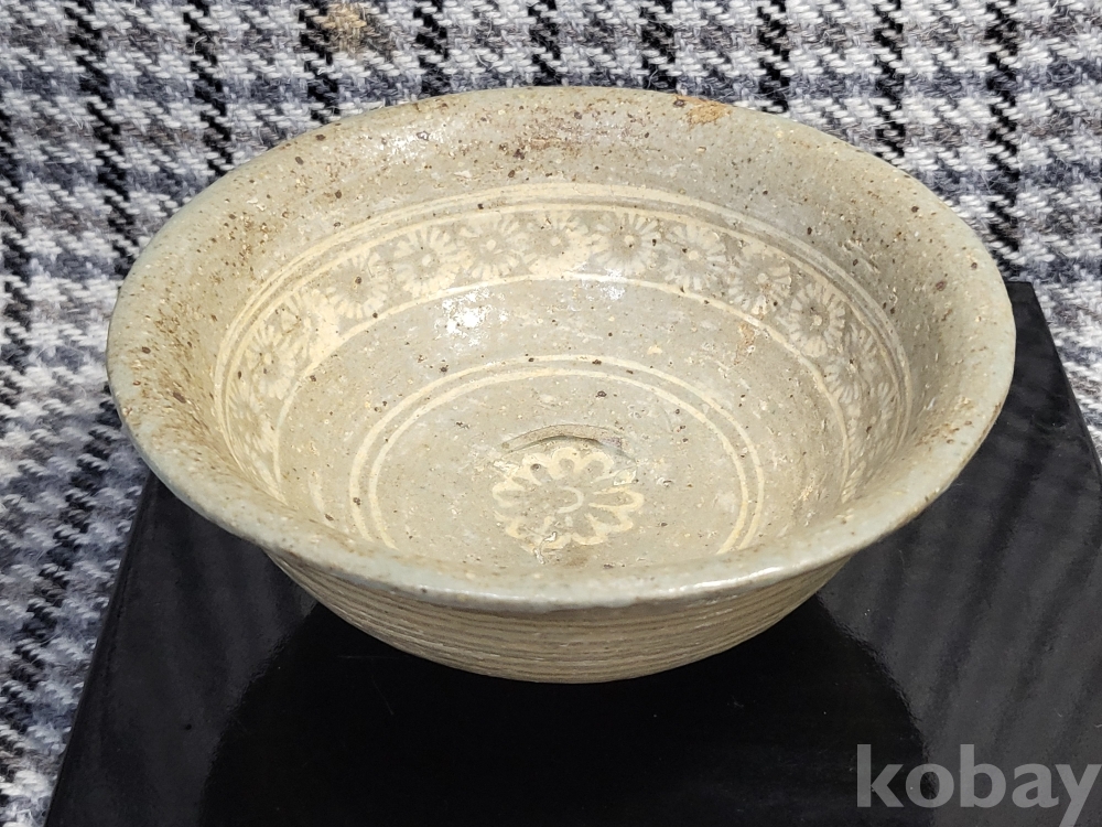 내면엔 국화인화문, 외면 다수의 선문이 백상감된 아름다운 분청사기 사발, 즉 다완입니다.