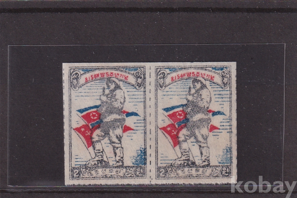 [윗동네 미사용 우표 모음展] - 8.15해방 5주년 기념 군인과 국기 2원 가로 페어