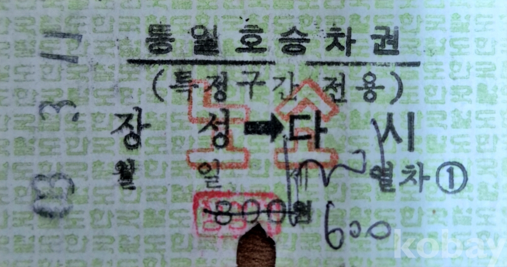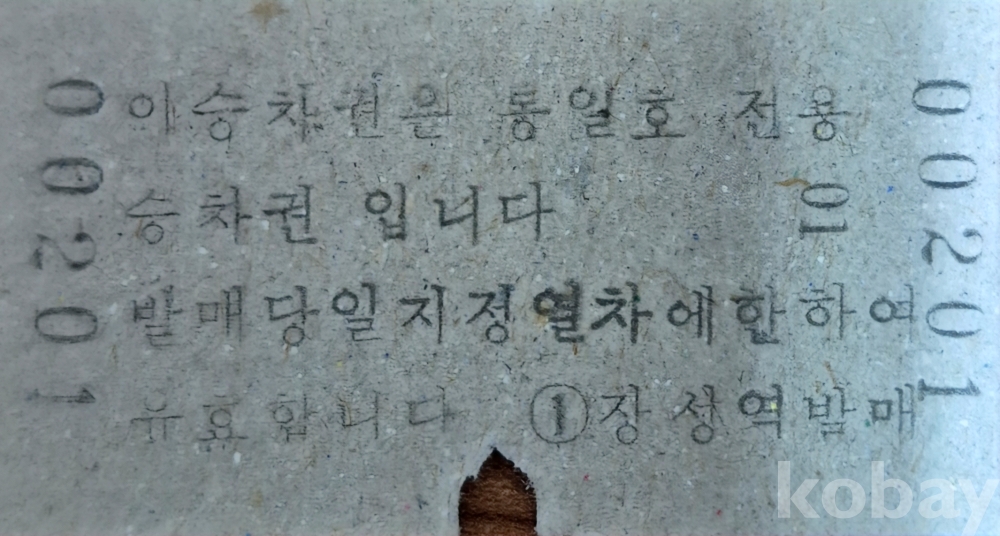 통일호 승차권(초기형광권) 장성-다시 노소입니다.