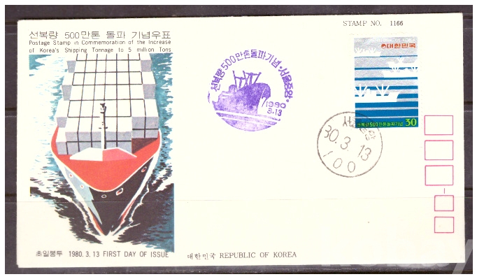 (초일봉피) 1980.3.13 선복량 500만톤 돌파기념 FDC (서울중앙)
