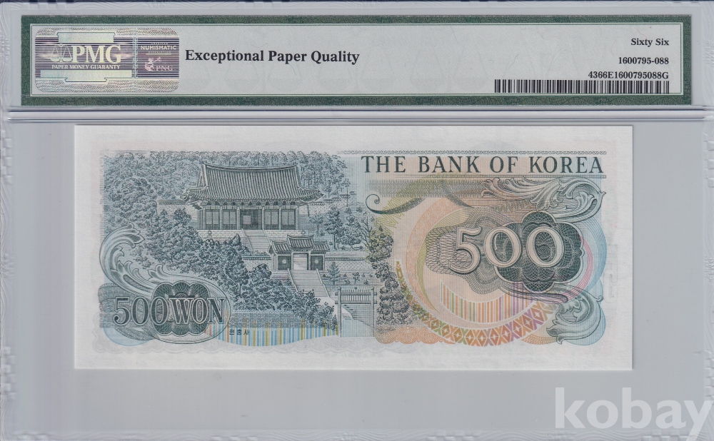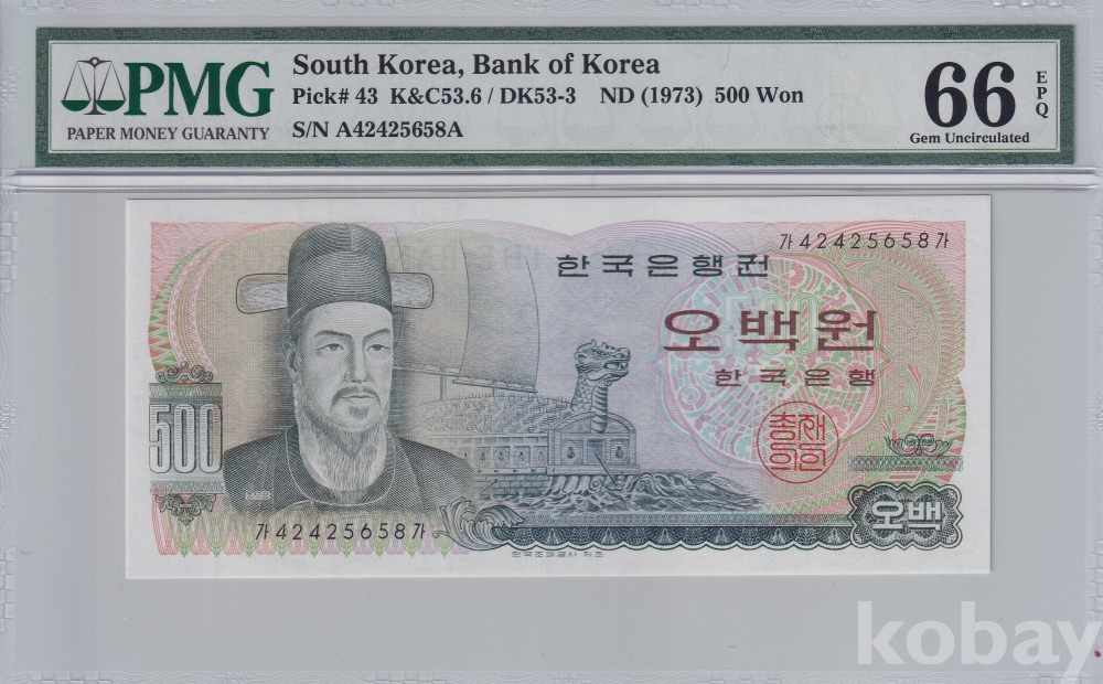 -희귀- 1973년 이순신 오백원 초판 기호 가가42포인트 PMG 66 EPQ 그레이딩 인증 지폐