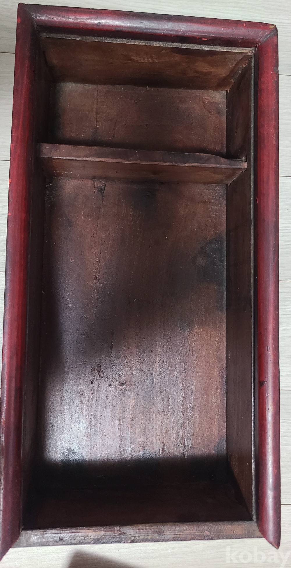 뚜껑을 열면 내부에는 벼루와 먹 등을 효율적으로 보관할 수 있도록 칸막이가 마련되어 있습니다. (사진상으로는 왼쪽 큰 칸과 오른쪽 작은 칸으로 나뉜 것이 보입니다.) 견고하게 짜여진 나무의 결이 살아있으며, 전반적으로 품격 있는 분위기를 자아냅니다.