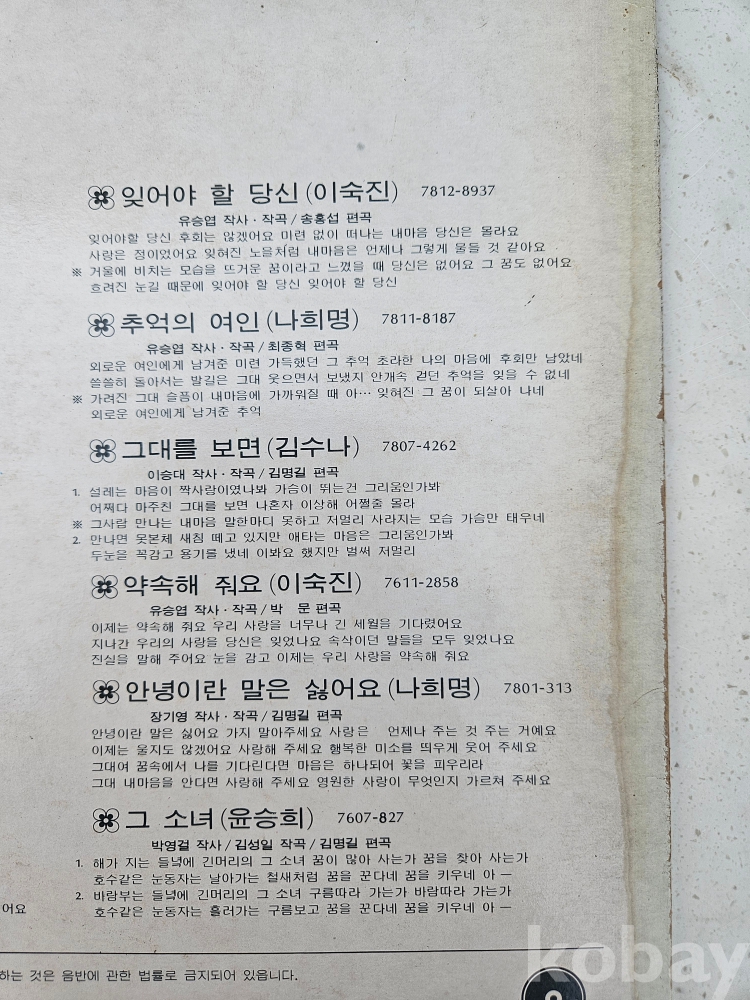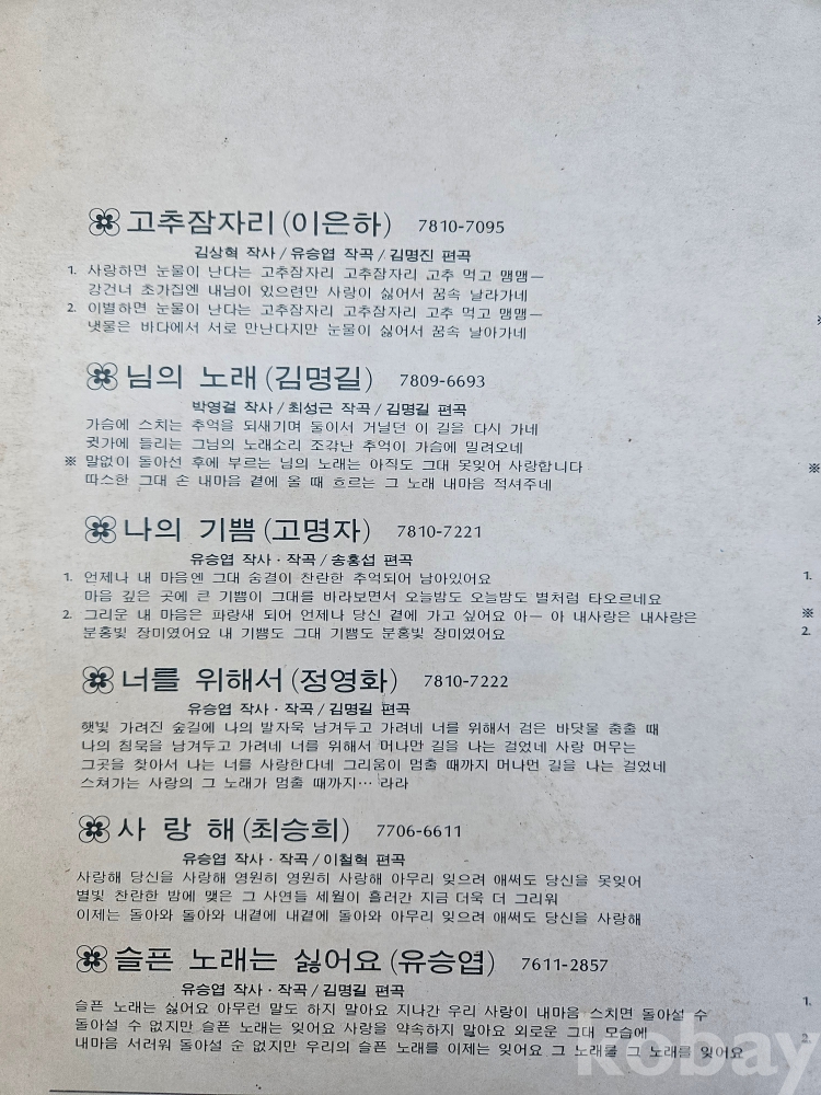 | 자켓상태 | EX : 약간의 마모, 모서리 찢김 존재 | 음반상태 | NM : 개봉했으나 미사용급, 스크래치 없음 | 발매정보 | 초반 | 가사지여부 | 무 |
