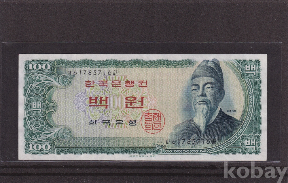 - 한국은행 1965년 세종 백원 줄세우기 6포인트 사용제 지폐