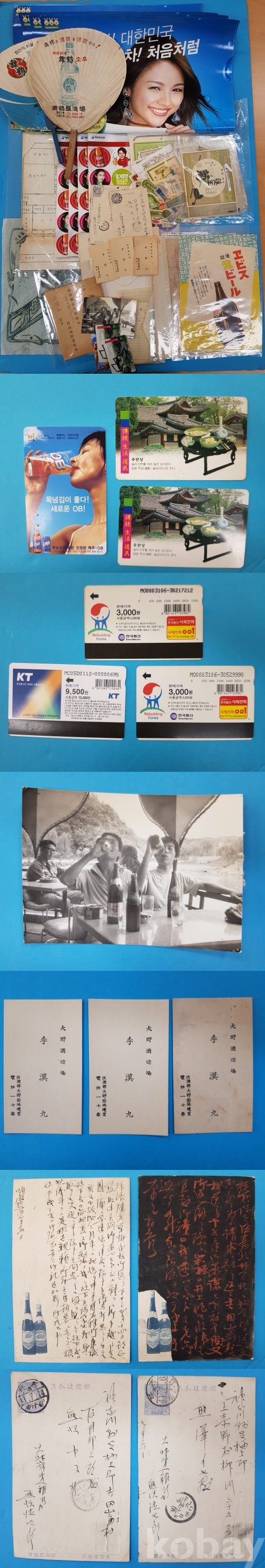 **** 처음처럼 포스터(이효리) 4부, 하이트진로 스티커 4부, 청일주조합자회사 평면도, 무학양조장 부채 2점, 맥주(LAGER-BEER) 광고가 시린 일제강점기 상표, 청일주조합자회사 포장지, 양조총담(일제강점기), 대일본맥주주식회사 광고지, 1961년 군산주류업조합 영수증 9부, 동양백주주식회사 사령장(1971년), 일제강점기 술상표 약 70여점, 맥주광고가 실린 일본엽서(2매), 대야주조장 명함 3점, 유흥주점 명세서 수십여부, 신촌로타리 그린힐 개업인사장, 맥주 마시는 사진, 술 관련 전화카드(3장)