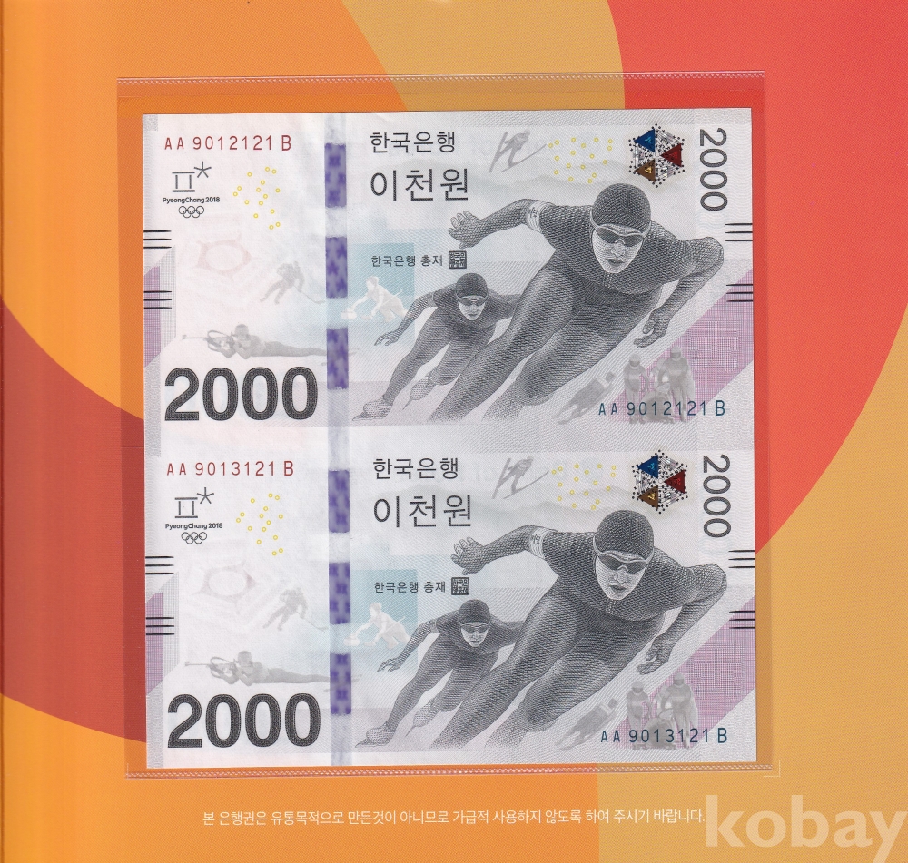 - 2018년 평창 올림픽기념 2,000원 초판 AAB 9012121 / AAB 9013121 - 2연결권 미사용 지폐 입니다.