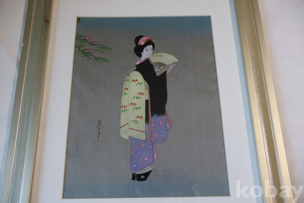 멋진 비단화 임니다 게이샤의 모습을 가진 화가의 낙관을 가진 명화 임니다 액자는 세월의 흔적이 보임니다
