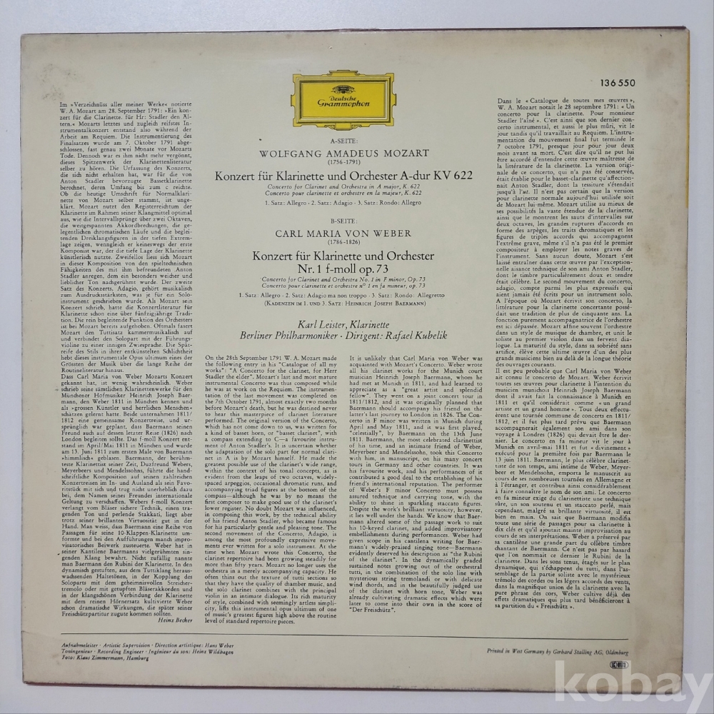 모차르트와 베버의 클라리넷 협주곡을 담고 있는 도이치 그라모폰(Deutsche Grammophon)의 스테레오 LP입니다.
