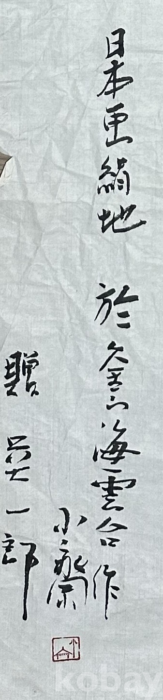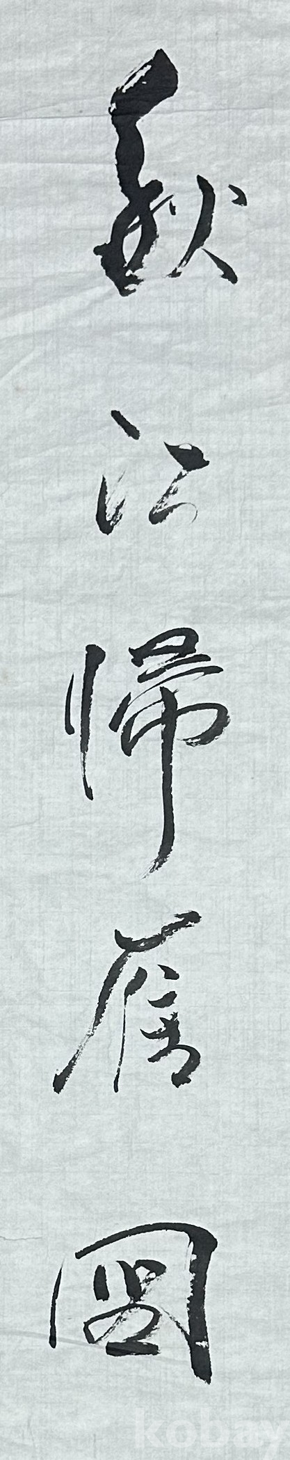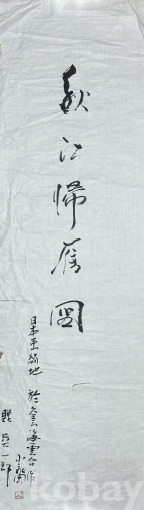 세로로 길게 펼쳐지는 구성 속에 힘 있는 필획으로 가을 강을 뜻하는 문구를 담아낸 서예 작품이다. 상단의 굵고 강한 초서 스타일과 하단의 비교적 정제된 필획이 대비되며, 화면 전체에 자연스럽게 번지는 먹의 농담이 동양적 여백의 미를 강조한다. 작품 전면에서 가벼운 구김은 있으나, 서예 작품 특유의 운치와 표현의 흐름은 잘 보존되어 있다. 공간 장식용으로도 안정감 있는 분위기를 주는 전통 서예 작품이다.