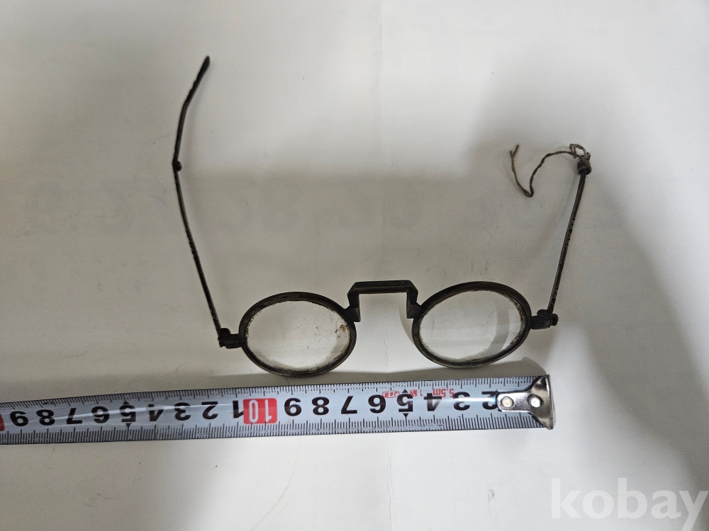 금속(또는 놋쇠) 재질의 프레임에, 당시 제작 방식 특유의 두꺼운 렌즈와 단단한 경첩 구조, 그리고 각진 코받침(노즈 브릿지) 형태가 특징입니다.