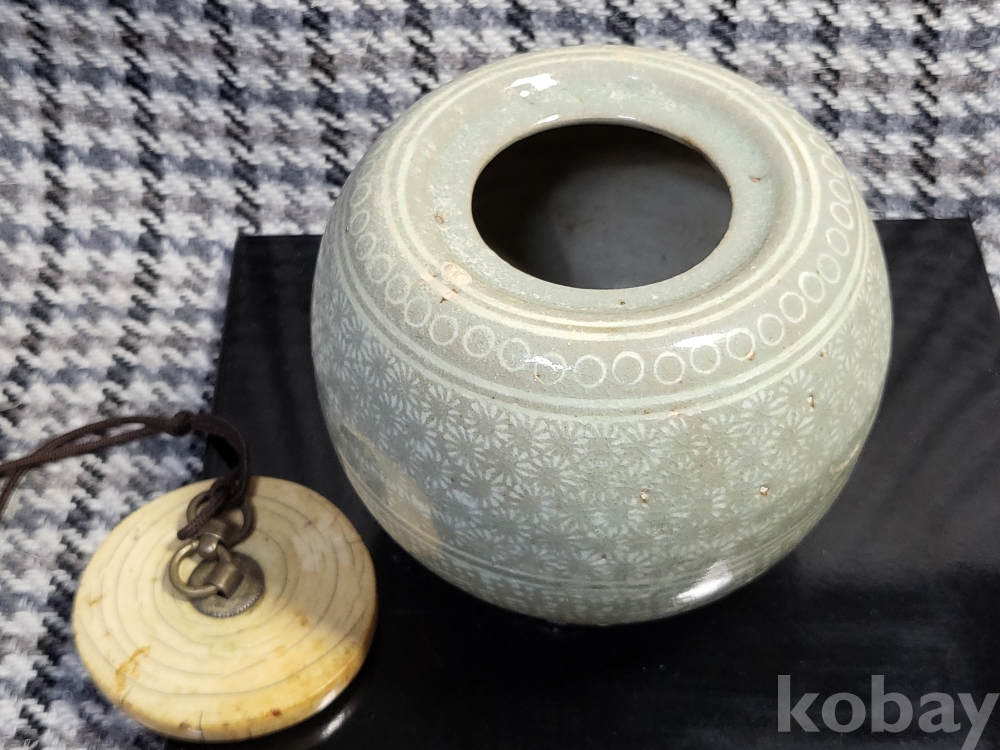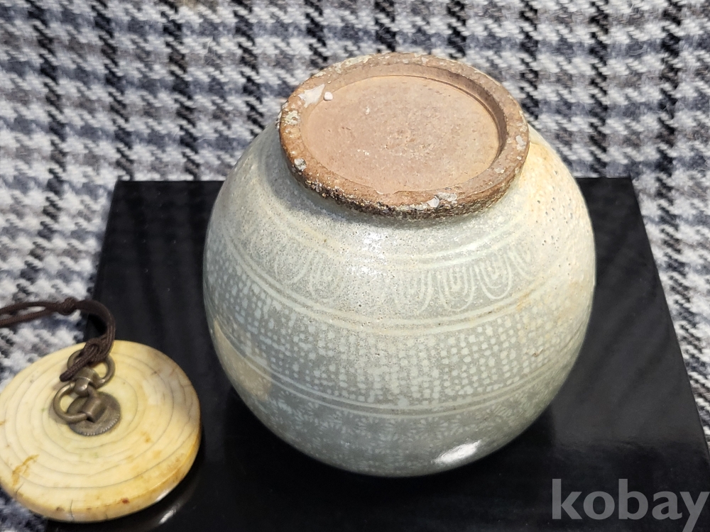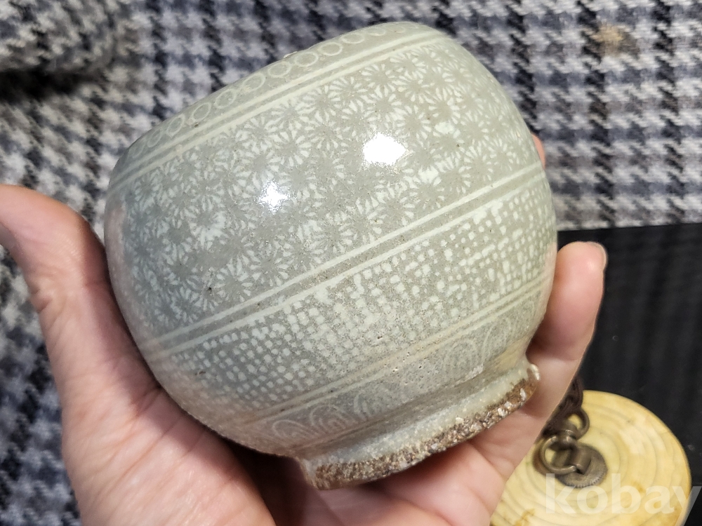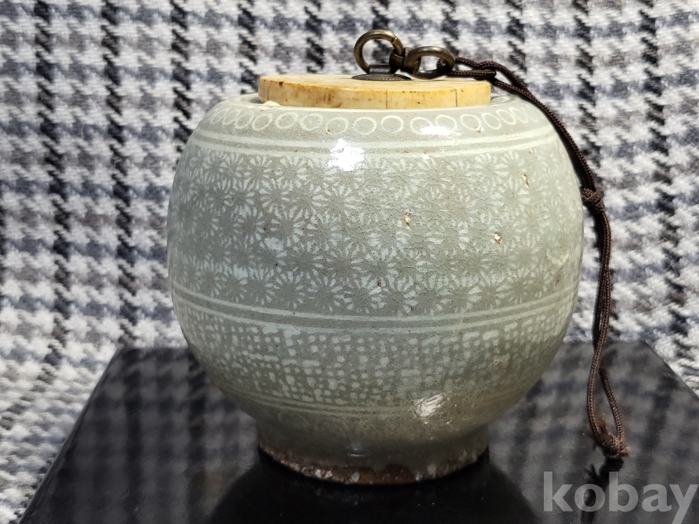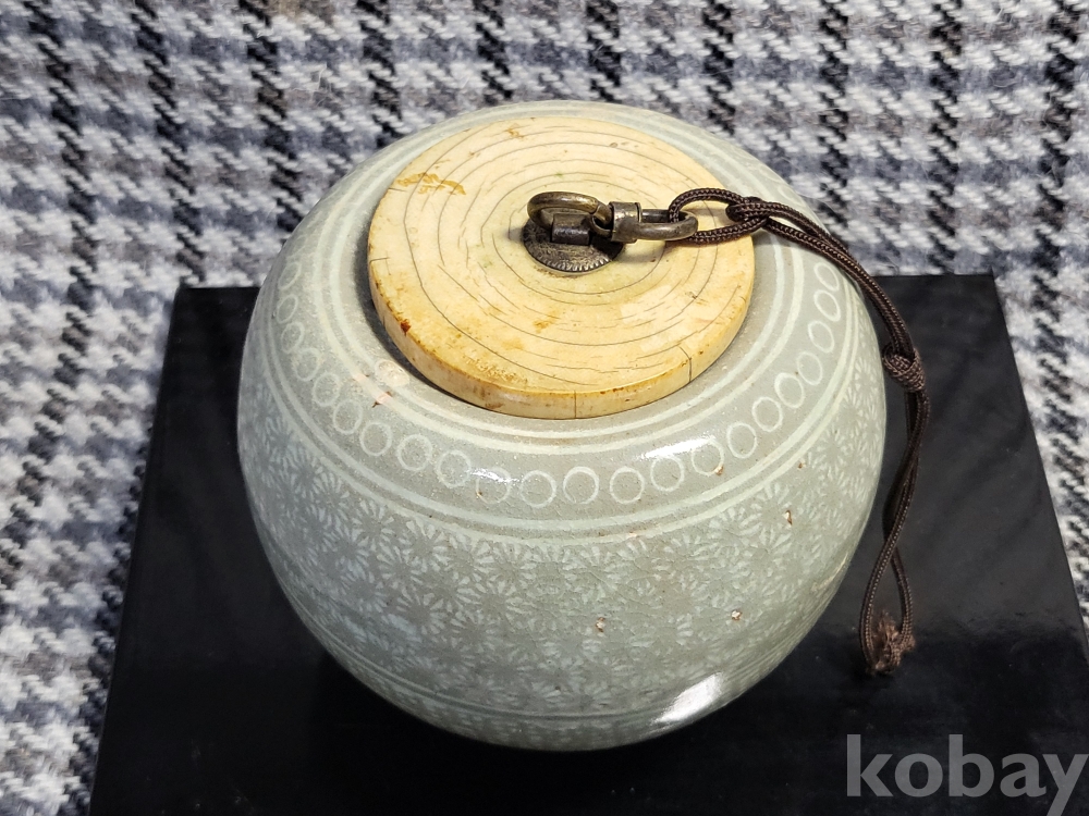 굵고 묵직한 상아재진에 백동장식고리가 달린 뚜껑이 얹혀진 분청사기 백상감 국화인화문 상아뚜껑 소호, 차호,약호입니다.