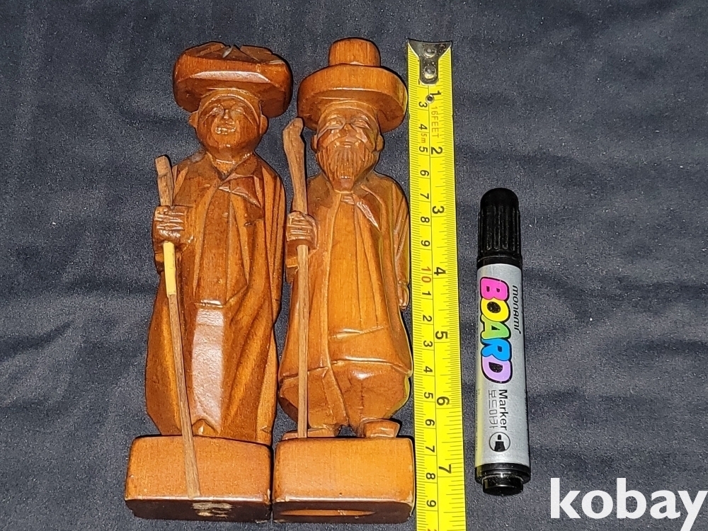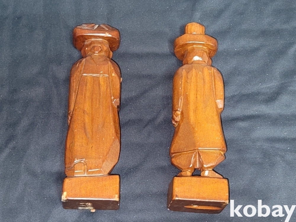빈티지 세월 감이 느껴지는 오래된 원목 나무 노부부 조각상입니다.
